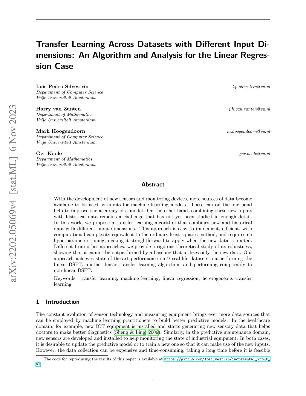 With the development of new sensors and monitoring devices, more sources of data become available to be used as inputs for machine learning models. These can on the one hand help to improve the accuracy of a model. On the other hand, combining these new inputs with historical data remains a challenge that has not yet been studied in enough detail. In this work, we propose a transfer learning algorithm that combines new and historical data with different input dimensions. This approach is easy to implement, efficient, with computational complexity equivalent to the ordinary least-squares method, and requires no hyperparameter tuning, making it straightforward to apply when the new data is limited. Different from other approaches, we provide a rigorous theoretical study of its robustness, showing that it cannot be outperformed by a baseline that utilizes only the new data. Our approach achieves state-of-the-art performance on 9 real-life datasets, outperforming the linear DSFT, another linear transfer learning algorithm, and performing comparably to non-linear DSFT.