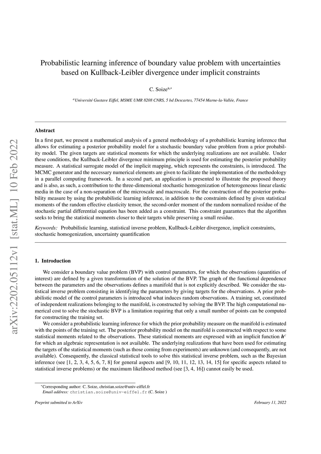 In a first part, we present a mathematical analysis of a general methodology of a probabilistic learning inference that allows for estimating a posterior probability model for a stochastic boundary value problem from a prior probability model. The given targets are statistical moments for which the underlying realizations are not available. Under these conditions, the Kullback-Leibler divergence minimum principle is used for estimating the posterior probability measure. A statistical surrogate model of the implicit mapping, which represents the constraints, is introduced. The MCMC generator and the necessary numerical elements are given to facilitate the implementation of the methodology in a parallel computing framework. In a second part, an application is presented to illustrate the proposed theory and is also, as such, a contribution to the three-dimensional stochastic homogenization of heterogeneous linear elastic media in the case of a non-separation of the microscale and macroscale. For the construction of the posterior probability measure by using the probabilistic learning inference, in addition to the constraints defined by given statistical moments of the random effective elasticity tensor, the second-order moment of the random normalized residue of the stochastic partial differential equation has been added as a constraint. This constraint guarantees that the algorithm seeks to bring the statistical moments closer to their targets while preserving a small residue.