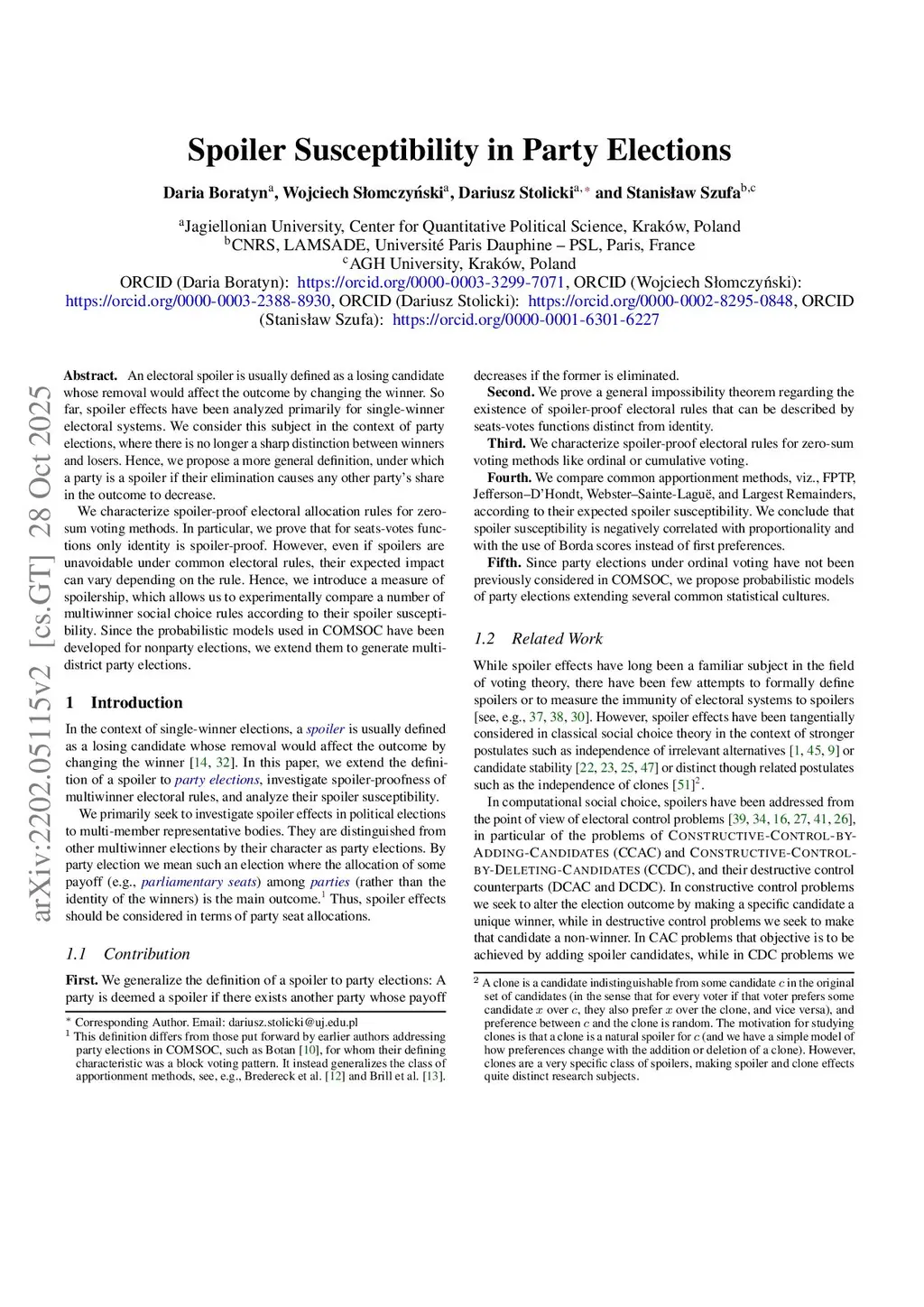 An electoral spoiler is usually defined as a losing candidate whose removal would affect the outcome by changing the winner. So far, spoiler effects have been analyzed primarily for single-winner electoral systems. We consider this subject in the context of party elections, where there is no longer a sharp distinction between winners and losers. Hence, we propose a more general definition, under which a party is a spoiler if their elimination causes any other party's share in the outcome to decrease. We characterize spoiler-proof electoral allocation rules for zero-sum voting methods. In particular, we prove that for seats-votes functions only identity is spoiler-proof. However, even if spoilers are unavoidable under common electoral rules, their expected impact can vary depending on the rule. Hence, we introduce a measure of spoilership, which allows us to experimentally compare a number of multiwinner social choice rules according to their spoiler susceptibility. Since the probabilistic models used in COMSOC have been developed for nonparty elections, we extend them to generate multidistrict party elections.