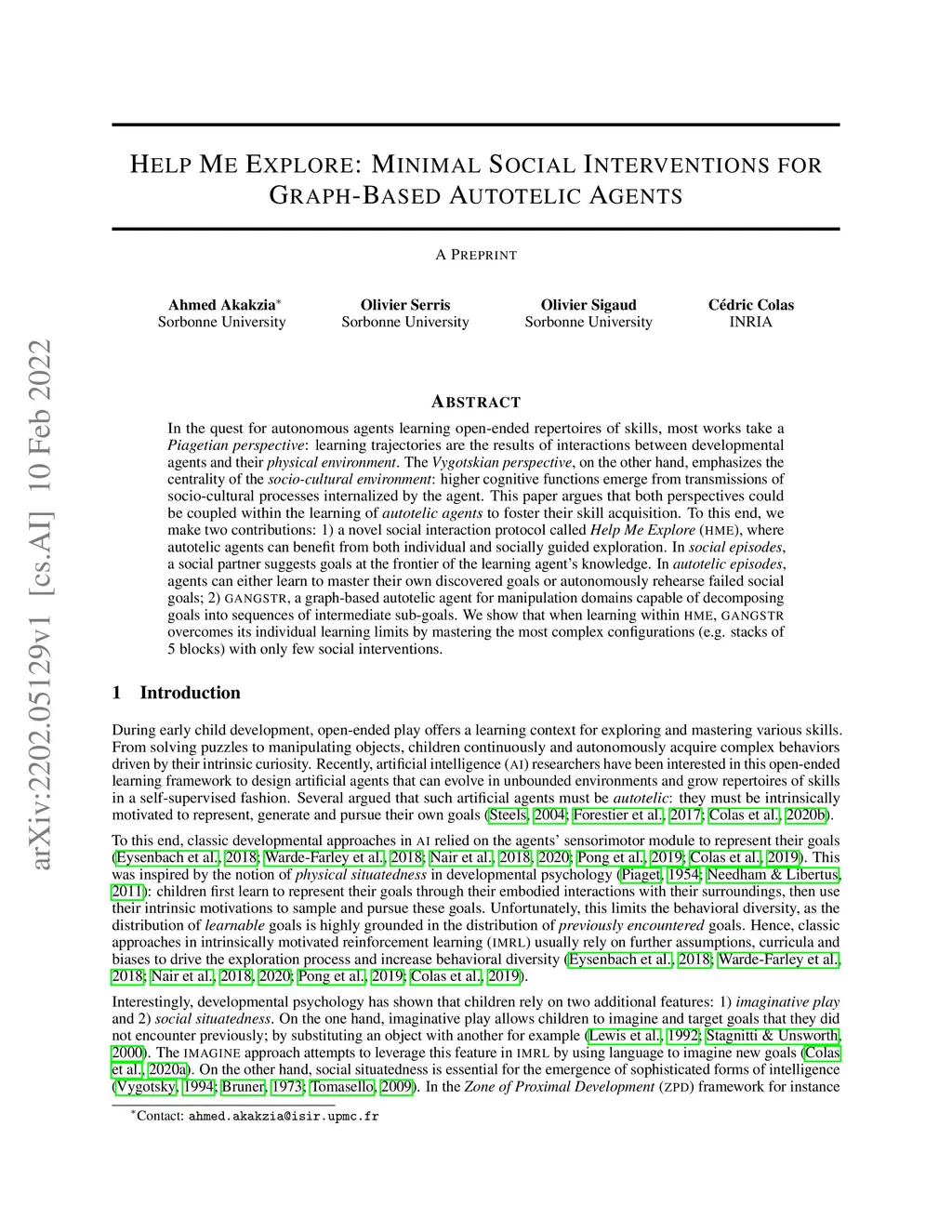 In the quest for autonomous agents learning open-ended repertoires of skills, most works take a Piagetian perspective: learning trajectories are the results of interactions between developmental agents and their physical environment. The Vygotskian perspective, on the other hand, emphasizes the centrality of the socio-cultural environment: higher cognitive functions emerge from transmissions of socio-cultural processes internalized by the agent. This paper argues that both perspectives could be coupled within the learning of autotelic agents to foster their skill acquisition. To this end, we make two contributions: 1) a novel social interaction protocol called Help Me Explore (HME), where autotelic agents can benefit from both individual and socially guided exploration. In social episodes, a social partner suggests goals at the frontier of the learning agent knowledge. In autotelic episodes, agents can either learn to master their own discovered goals or autonomously rehearse failed social goals; 2) GANGSTR, a graph-based autotelic agent for manipulation domains capable of decomposing goals into sequences of intermediate sub-goals. We show that when learning within HME, GANGSTR overcomes its individual learning limits by mastering the most complex configurations (e.g. stacks of 5 blocks) with only few social interventions.