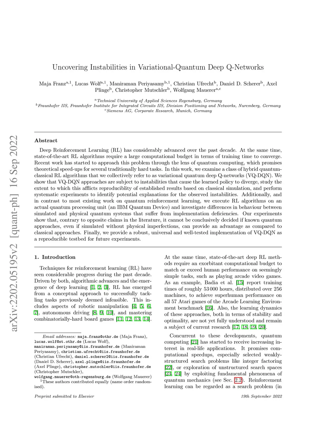 Deep Reinforcement Learning (RL) has considerably advanced over the past decade. At the same time, state-of-the-art RL algorithms require a large computational budget in terms of training time to converge. Recent work has started to approach this problem through the lens of quantum computing, which promises theoretical speed-ups for several traditionally hard tasks. In this work, we examine a class of hybrid quantum-classical RL algorithms that we collectively refer to as variational quantum deep Q-networks (VQ-DQN). We show that VQ-DQN approaches are subject to instabilities that cause the learned policy to diverge, study the extent to which this afflicts reproduciblity of established results based on classical simulation, and perform systematic experiments to identify potential explanations for the observed instabilities. Additionally, and in contrast to most existing work on quantum reinforcement learning, we execute RL algorithms on an actual quantum processing unit (an IBM Quantum Device) and investigate differences in behaviour between simulated and physical quantum systems that suffer from implementation deficiencies. Our experiments show that, contrary to opposite claims in the literature, it cannot be conclusively decided if known quantum approaches, even if simulated without physical imperfections, can provide an advantage as compared to classical approaches. Finally, we provide a robust, universal and well-tested implementation of VQ-DQN as a reproducible testbed for future experiments.