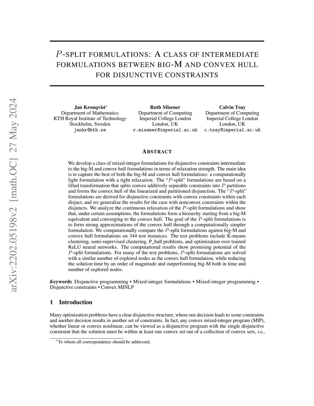 We develop a class of mixed-integer formulations for disjunctive constraints intermediate to the big-M and convex hull formulations in terms of relaxation strength. The main idea is to capture the best of both the big-M and convex hull formulations: a computationally light formulation with a tight relaxation. The "P-split" formulations are based on a lifted transformation that splits convex additively separable constraints into P partitions and forms the convex hull of the linearized and partitioned disjunction. The "P-split" formulations are derived for disjunctive constraints with convex constraints within each disjunct, and we generalize the results for the case with nonconvex constraints within the disjuncts. We analyze the continuous relaxation of the P-split formulations and show that, under certain assumptions, the formulations form a hierarchy starting from a big-M equivalent and converging to the convex hull. We computationally compare the P-split formulations against big-M and convex hull formulations on 344 test instances. The test problems include K-means clustering, semi-supervised clustering, P_ball problems, and optimization over trained ReLU neural networks. The computational results show promising potential of the P-split formulations. For many of the test problems, P-split formulations are solved with a similar number of explored nodes as the convex hull formulation, while reducing the solution time by an order of magnitude and outperforming big-M both in time and number of explored nodes.