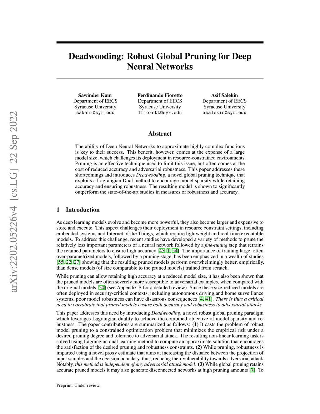 The ability of Deep Neural Networks to approximate highly complex functions is key to their success. This benefit, however, comes at the expense of a large model size, which challenges its deployment in resource-constrained environments. Pruning is an effective technique used to limit this issue, but often comes at the cost of reduced accuracy and adversarial robustness. This paper addresses these shortcomings and introduces Deadwooding, a novel global pruning technique that exploits a Lagrangian Dual method to encourage model sparsity while retaining accuracy and ensuring robustness. The resulting model is shown to significantly outperform the state-of-the-art studies in measures of robustness and accuracy.