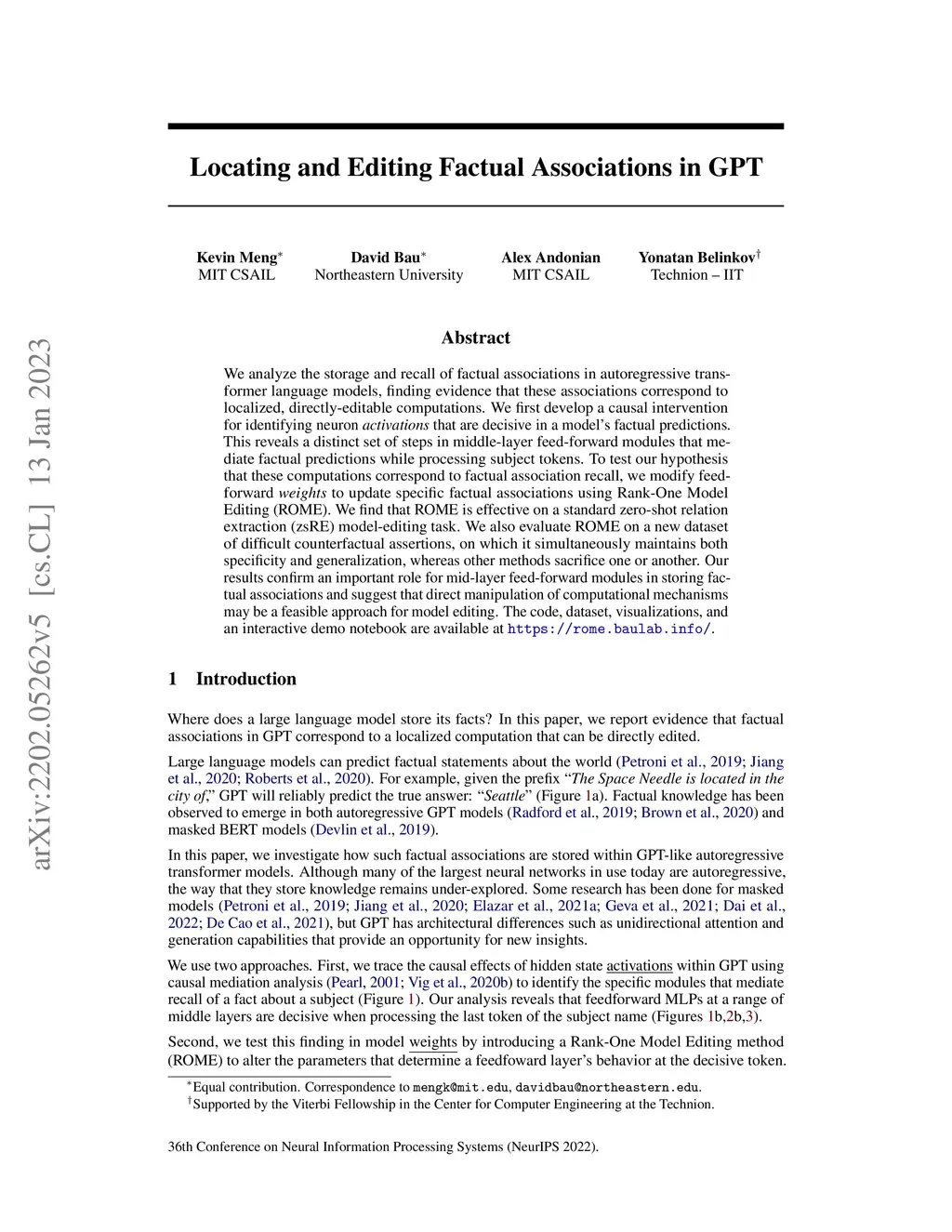 We analyze the storage and recall of factual associations in autoregressive transformer language models, finding evidence that these associations correspond to localized, directly-editable computations. We first develop a causal intervention for identifying neuron activations that are decisive in a model's factual predictions. This reveals a distinct set of steps in middle-layer feed-forward modules that mediate factual predictions while processing subject tokens. To test our hypothesis that these computations correspond to factual association recall, we modify feed-forward weights to update specific factual associations using Rank-One Model Editing (ROME). We find that ROME is effective on a standard zero-shot relation extraction (zsRE) model-editing task, comparable to existing methods. To perform a more sensitive evaluation, we also evaluate ROME on a new dataset of counterfactual assertions, on which it simultaneously maintains both specificity and generalization, whereas other methods sacrifice one or another. Our results confirm an important role for mid-layer feed-forward modules in storing factual associations and suggest that direct manipulation of computational mechanisms may be a feasible approach for model editing. The code, dataset, visualizations, and an interactive demo notebook are available at https://rome.baulab.info/