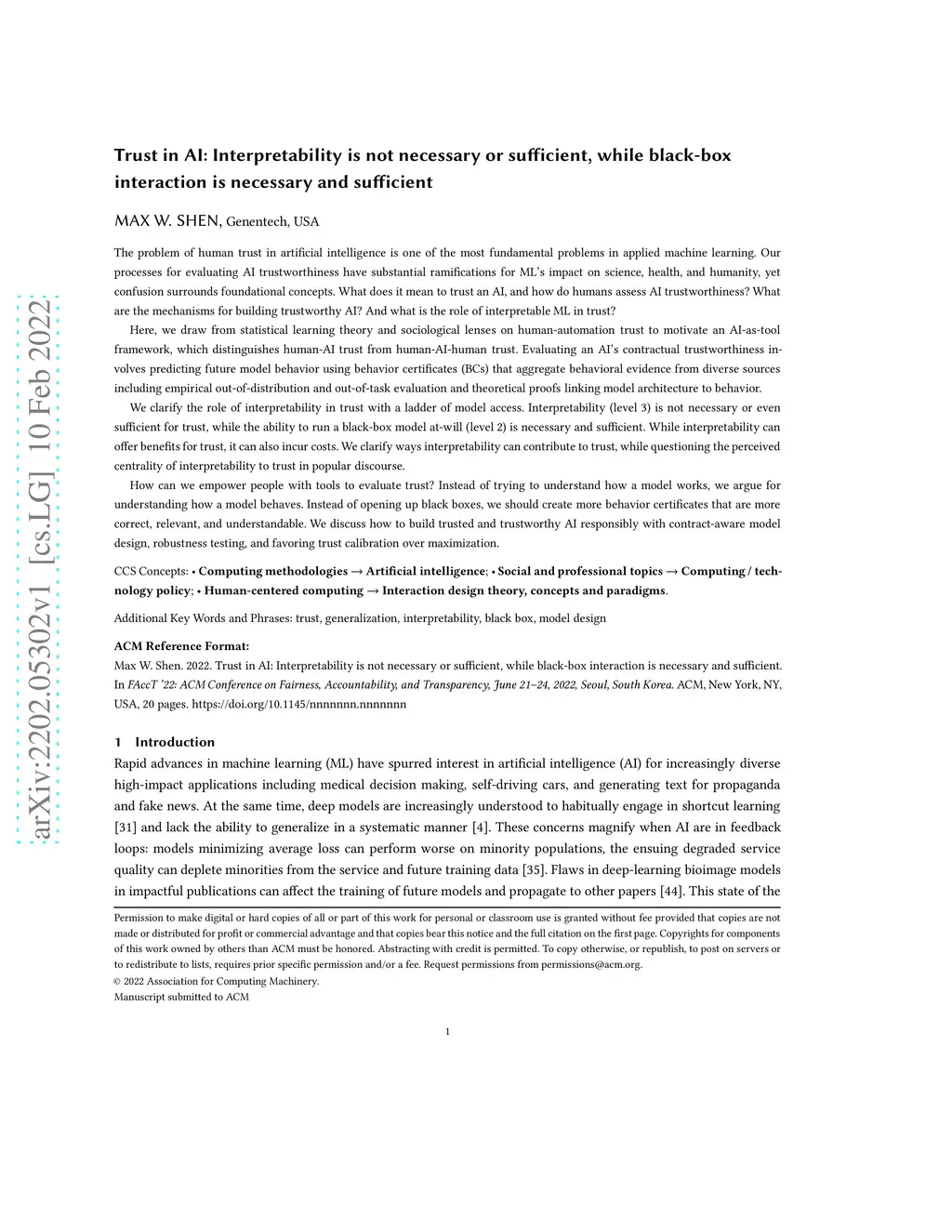 The problem of human trust in artificial intelligence is one of the most fundamental problems in applied machine learning. Our processes for evaluating AI trustworthiness have substantial ramifications for ML's impact on science, health, and humanity, yet confusion surrounds foundational concepts. What does it mean to trust an AI, and how do humans assess AI trustworthiness? What are the mechanisms for building trustworthy AI? And what is the role of interpretable ML in trust? Here, we draw from statistical learning theory and sociological lenses on human-automation trust to motivate an AI-as-tool framework, which distinguishes human-AI trust from human-AI-human trust. Evaluating an AI's contractual trustworthiness involves predicting future model behavior using behavior certificates (BCs) that aggregate behavioral evidence from diverse sources including empirical out-of-distribution and out-of-task evaluation and theoretical proofs linking model architecture to behavior. We clarify the role of interpretability in trust with a ladder of model access. Interpretability (level 3) is not necessary or even sufficient for trust, while the ability to run a black-box model at-will (level 2) is necessary and sufficient. While interpretability can offer benefits for trust, it can also incur costs. We clarify ways interpretability can contribute to trust, while questioning the perceived centrality of interpretability to trust in popular discourse. How can we empower people with tools to evaluate trust? Instead of trying to understand how a model works, we argue for understanding how a model behaves. Instead of opening up black boxes, we should create more behavior certificates that are more correct, relevant, and understandable. We discuss how to build trusted and trustworthy AI responsibly.