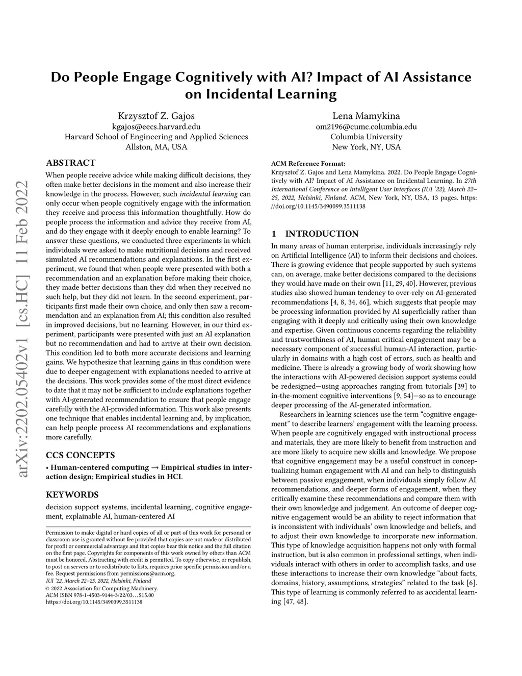 When people receive advice while making difficult decisions, they often make better decisions in the moment and also increase their knowledge in the process. However, such incidental learning can only occur when people cognitively engage with the information they receive and process this information thoughtfully. How do people process the information and advice they receive from AI, and do they engage with it deeply enough to enable learning? To answer these questions, we conducted three experiments in which individuals were asked to make nutritional decisions and received simulated AI recommendations and explanations. In the first experiment, we found that when people were presented with both a recommendation and an explanation before making their choice, they made better decisions than they did when they received no such help, but they did not learn. In the second experiment, participants first made their own choice, and only then saw a recommendation and an explanation from AI; this condition also resulted in improved decisions, but no learning. However, in our third experiment, participants were presented with just an AI explanation but no recommendation and had to arrive at their own decision. This condition led to both more accurate decisions and learning gains. We hypothesize that learning gains in this condition were due to deeper engagement with explanations needed to arrive at the decisions. This work provides some of the most direct evidence to date that it may not be sufficient to include explanations together with AI-generated recommendation to ensure that people engage carefully with the AI-provided information. This work also presents one technique that enables incidental learning and, by implication, can help people process AI recommendations and explanations more carefully.