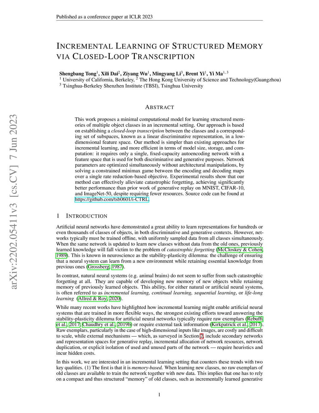 This work proposes a minimal computational model for learning structured memories of multiple object classes in an incremental setting. Our approach is based on establishing a closed-loop transcription between the classes and a corresponding set of subspaces, known as a linear discriminative representation, in a low-dimensional feature space. Our method is simpler than existing approaches for incremental learning, and more efficient in terms of model size, storage, and computation: it requires only a single, fixed-capacity autoencoding network with a feature space that is used for both discriminative and generative purposes. Network parameters are optimized simultaneously without architectural manipulations, by solving a constrained minimax game between the encoding and decoding maps over a single rate reduction-based objective. Experimental results show that our method can effectively alleviate catastrophic forgetting, achieving significantly better performance than prior work of generative replay on MNIST, CIFAR-10, and ImageNet-50, despite requiring fewer resources. Source code can be found at https://github.com/tsb0601/i-CTRL