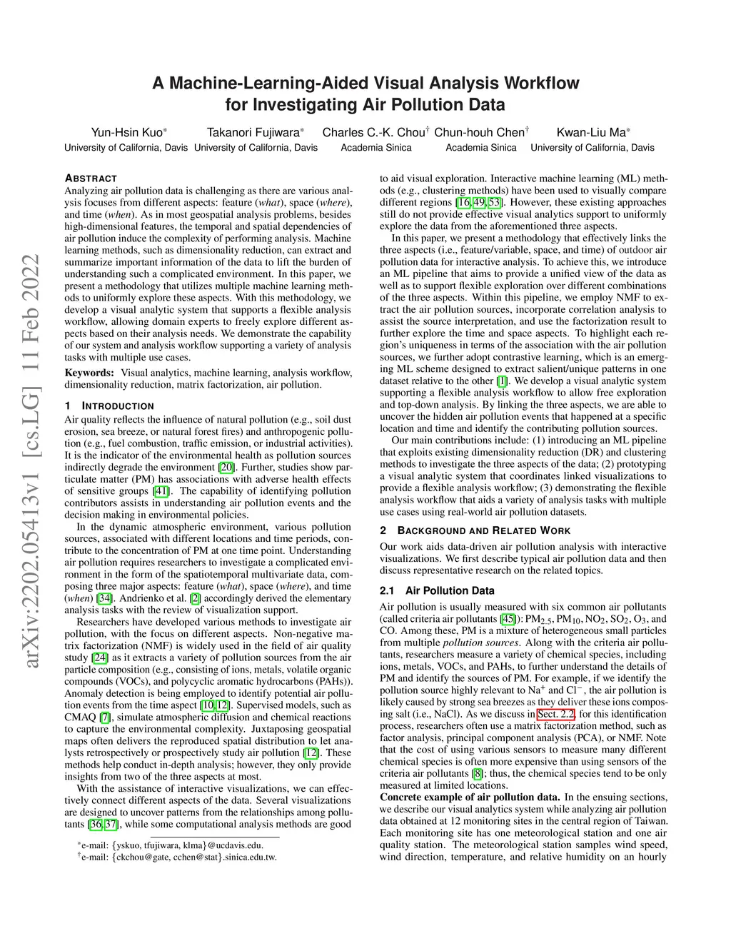 Analyzing air pollution data is challenging as there are various analysis focuses from different aspects: feature (what), space (where), and time (when). As in most geospatial analysis problems, besides high-dimensional features, the temporal and spatial dependencies of air pollution induce the complexity of performing analysis. Machine learning methods, such as dimensionality reduction, can extract and summarize important information of the data to lift the burden of understanding such a complicated environment. In this paper, we present a methodology that utilizes multiple machine learning methods to uniformly explore these aspects. With this methodology, we develop a visual analytic system that supports a flexible analysis workflow, allowing domain experts to freely explore different aspects based on their analysis needs. We demonstrate the capability of our system and analysis workflow supporting a variety of analysis tasks with multiple use cases.