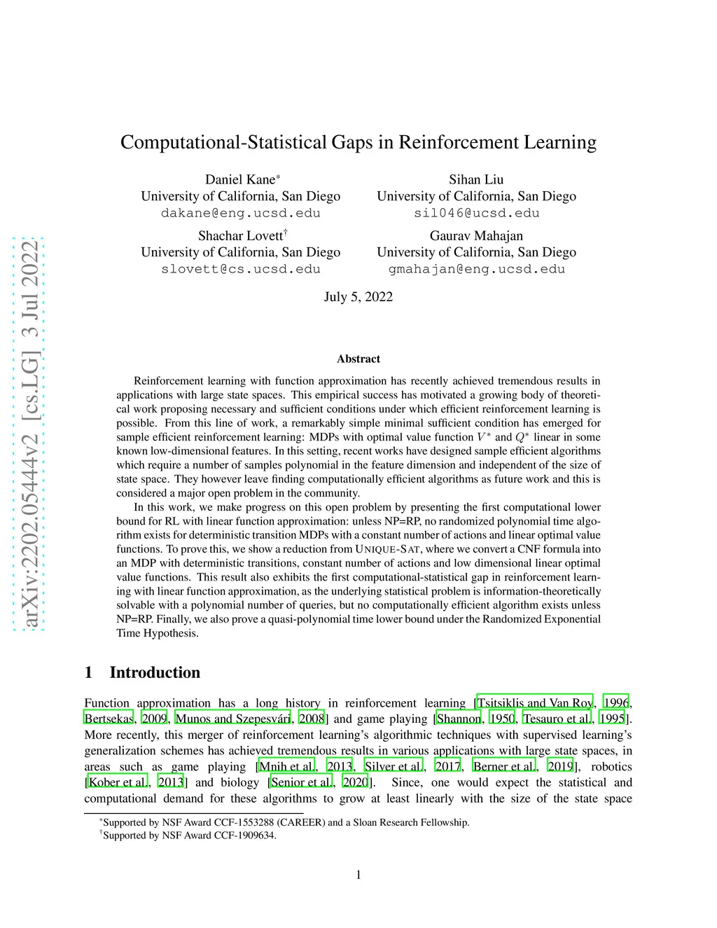 Reinforcement learning with function approximation has recently achieved tremendous results in applications with large state spaces. This empirical success has motivated a growing body of theoretical work proposing necessary and sufficient conditions under which efficient reinforcement learning is possible. From this line of work, a remarkably simple minimal sufficient condition has emerged for sample efficient reinforcement learning: MDPs with optimal value function and linear in some known low-dimensional features. In this setting, recent works have designed sample efficient algorithms which require a number of samples polynomial in the feature dimension and independent of the size of state space. They however leave finding computationally efficient algorithms as future work and this is considered a major open problem in the community. In this work, we make progress on this open problem by presenting the first computational lower bound for RL with linear function approximation: unless NP=RP, no randomized polynomial time algorithm exists for deterministic transition MDPs with a constant number of actions and linear optimal value functions. To prove this, we show a reduction from Unique-Sat, where we convert a CNF formula into an MDP with deterministic transitions, constant number of actions and low dimensional linear optimal value functions. This result also exhibits the first computational-statistical gap in reinforcement learning with linear function approximation, as the underlying statistical problem is information-theoretically solvable with a polynomial number of queries, but no computationally efficient algorithm exists unless NP=RP. Finally, we also prove a quasi-polynomial time lower bound under the Randomized Exponential Time Hypothesis.