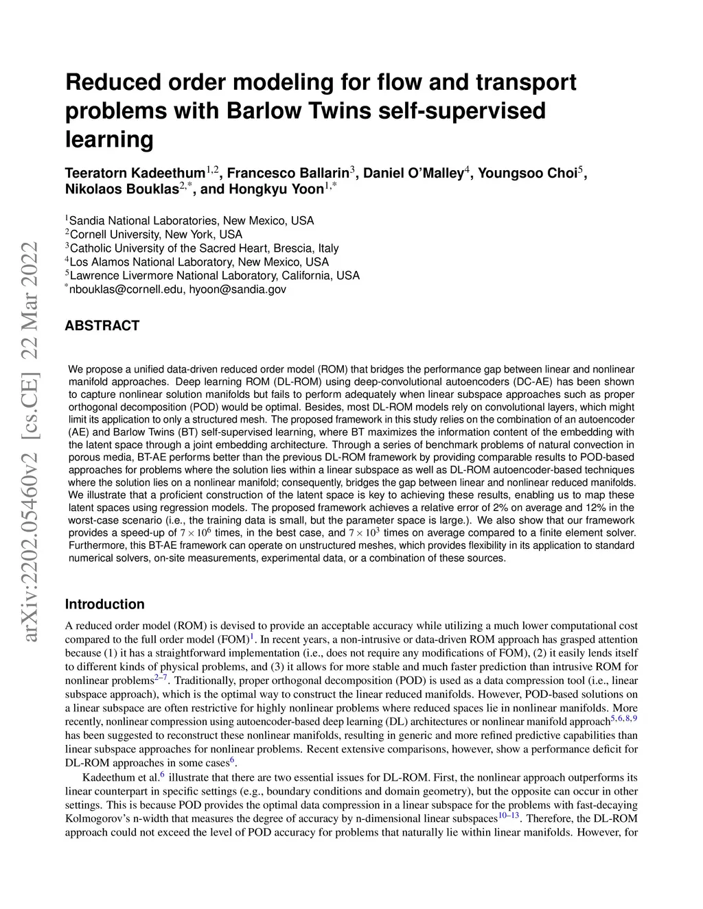 We propose a unified data-driven reduced order model (ROM) that bridges the performance gap between linear and nonlinear manifold approaches. Deep learning ROM (DL-ROM) using deep-convolutional autoencoders (DC-AE) has been shown to capture nonlinear solution manifolds but fails to perform adequately when linear subspace approaches such as proper orthogonal decomposition (POD) would be optimal. Besides, most DL-ROM models rely on convolutional layers, which might limit its application to only a structured mesh. The proposed framework in this study relies on the combination of an autoencoder (AE) and Barlow Twins (BT) self-supervised learning, where BT maximizes the information content of the embedding with the latent space through a joint embedding architecture. Through a series of benchmark problems of natural convection in porous media, BT-AE performs better than the previous DL-ROM framework by providing comparable results to POD-based approaches for problems where the solution lies within a linear subspace as well as DL-ROM autoencoder-based techniques where the solution lies on a nonlinear manifold; consequently, bridges the gap between linear and nonlinear reduced manifolds. Furthermore, this BT-AE framework can operate on unstructured meshes, which provides flexibility in its application to standard numerical solvers, on-site measurements, experimental data, or a combination of these sources.
