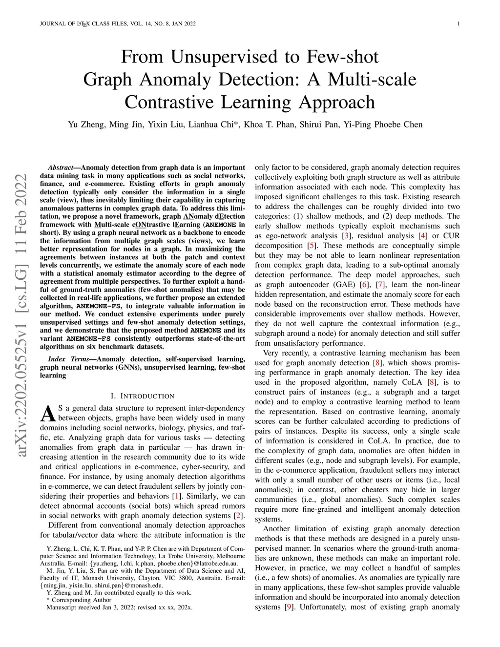 Anomaly detection from graph data is an important data mining task in many applications such as social networks, finance, and e-commerce. Existing efforts in graph anomaly detection typically only consider the information in a single scale (view), thus inevitably limiting their capability in capturing anomalous patterns in complex graph data. To address this limitation, we propose a novel framework, graph ANomaly dEtection framework with Multi-scale cONtrastive lEarning (ANEMONE in short). By using a graph neural network as a backbone to encode the information from multiple graph scales (views), we learn better representation for nodes in a graph. In maximizing the agreements between instances at both the patch and context levels concurrently, we estimate the anomaly score of each node with a statistical anomaly estimator according to the degree of agreement from multiple perspectives. To further exploit a handful of ground-truth anomalies (few-shot anomalies) that may be collected in real-life applications, we further propose an extended algorithm, ANEMONE-FS, to integrate valuable information in our method. We conduct extensive experiments under purely unsupervised settings and few-shot anomaly detection settings, and we demonstrate that the proposed method ANEMONE and its variant ANEMONE-FS consistently outperform state-of-the-art algorithms on six benchmark datasets.
