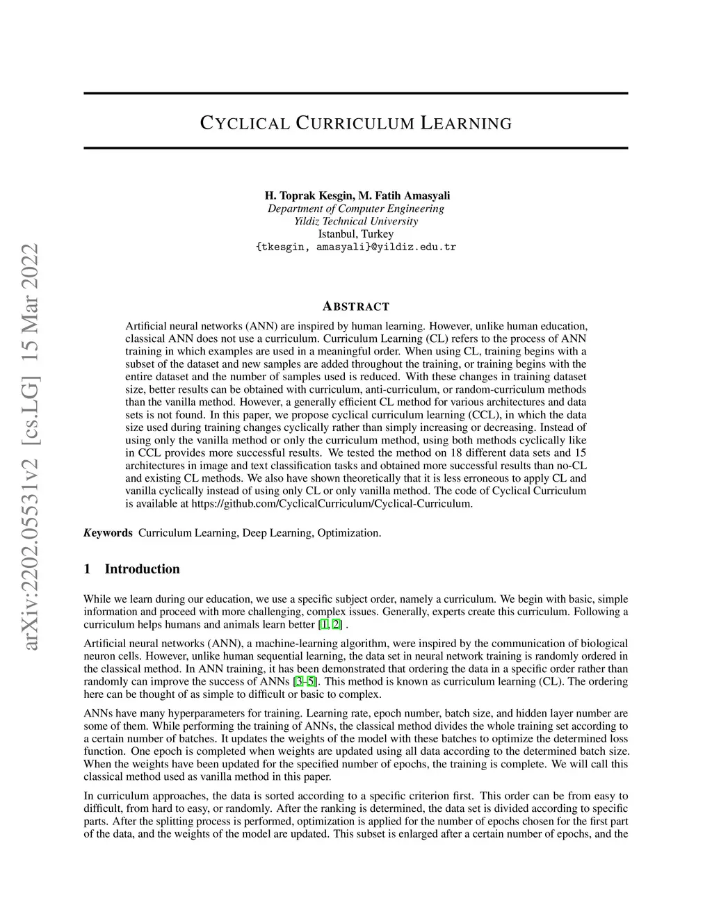 Artificial neural networks (ANN) are inspired by human learning. However, unlike human education, classical ANN does not use a curriculum. Curriculum Learning (CL) refers to the process of ANN training in which examples are used in a meaningful order. When using CL, training begins with a subset of the dataset and new samples are added throughout the training, or training begins with the entire dataset and the number of samples used is reduced. With these changes in training dataset size, better results can be obtained with curriculum, anti-curriculum, or random-curriculum methods than the vanilla method. However, a generally efficient CL method for various architectures and data sets is not found. In this paper, we propose cyclical curriculum learning (CCL), in which the data size used during training changes cyclically rather than simply increasing or decreasing. Instead of using only the vanilla method or only the curriculum method, using both methods cyclically like in CCL provides more successful results. We tested the method on 18 different data sets and 15 architectures in image and text classification tasks and obtained more successful results than no-CL and existing CL methods. We also have shown theoretically that it is less erroneous to apply CL and vanilla cyclically instead of using only CL or only vanilla method. The code of Cyclical Curriculum is available at https://github.com/CyclicalCurriculum/Cyclical-Curriculum.
