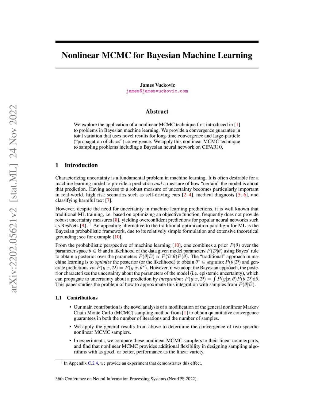 We explore the application of a nonlinear MCMC technique first introduced in [1] to problems in Bayesian machine learning. We provide a convergence guarantee in total variation that uses novel results for long-time convergence and large-particle ("propagation of chaos") convergence. We apply this nonlinear MCMC technique to sampling problems including a Bayesian neural network on CIFAR10.