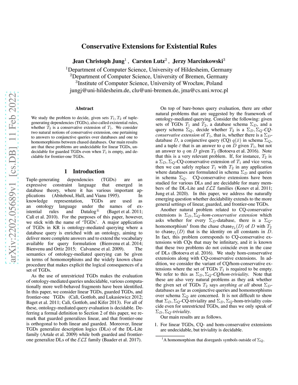 We study the problem to decide, given sets T1,T2 of tuple-generating dependencies (TGDs), also called existential rules, whether T2 is a conservative extension of T1. We consider two natural notions of conservative extension, one pertaining to answers to conjunctive queries over databases and one to homomorphisms between chased databases. Our main results are that these problems are undecidable for linear TGDs, undecidable for guarded TGDs even when T1 is empty, and decidable for frontier-one TGDs.