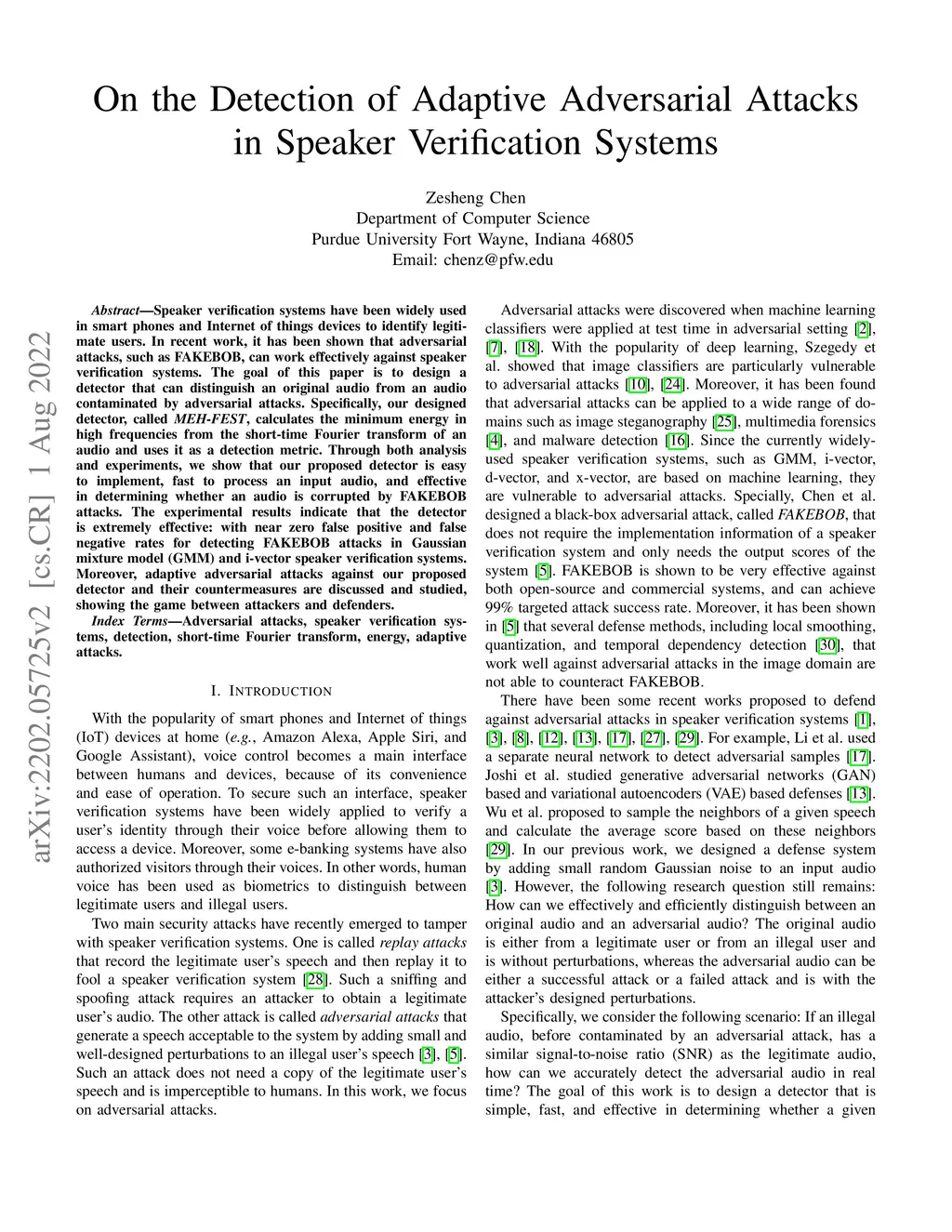Speaker verification systems have been widely used in smart phones and Internet of things devices to identify a legitimate user. In recent work, it has been shown that adversarial attacks, such as FAKEBOB, can work effectively against speaker verification systems. The goal of this paper is to design a detector that can distinguish an original audio from an audio contaminated by adversarial attacks. Specifically, our designed detector, called MEH-FEST, calculates the minimum energy in high frequencies from the short-time Fourier transform of an audio and uses it as a detection metric. Through both analysis and experiments, we show that our proposed detector is easy to implement, fast to process an input audio, and effective in determining whether an audio is corrupted by FAKEBOB attacks. The experimental results indicate that the detector is extremely effective: with near zero false positive and false negative rates for detecting FAKEBOB attacks in Gaussian mixture model (GMM) and i-vector speaker verification systems. Moreover, adaptive adversarial attacks against our proposed detector and their countermeasures are discussed and studied, showing the game between attackers and defenders.