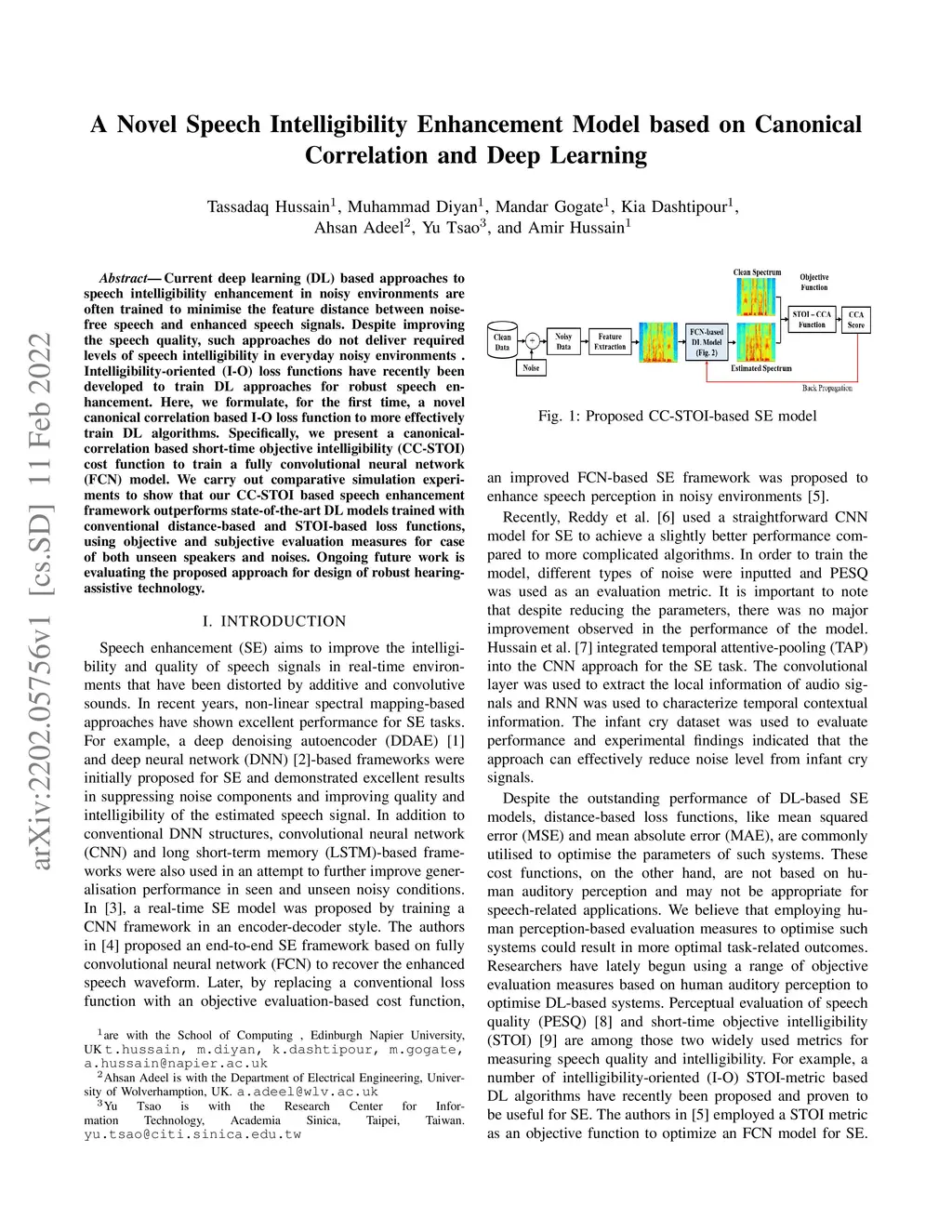 Current deep learning (DL) based approaches to speech intelligibility enhancement in noisy environments are often trained to minimise the feature distance between noise-free speech and enhanced speech signals. Despite improving the speech quality, such approaches do not deliver required levels of speech intelligibility in everyday noisy environments . Intelligibility-oriented (I-O) loss functions have recently been developed to train DL approaches for robust speech enhancement. Here, we formulate, for the first time, a novel canonical correlation based I-O loss function to more effectively train DL algorithms. Specifically, we present a canonical-correlation based short-time objective intelligibility (CC-STOI) cost function to train a fully convolutional neural network (FCN) model. We carry out comparative simulation experiments to show that our CC-STOI based speech enhancement framework outperforms state-of-the-art DL models trained with conventional distance-based and STOI-based loss functions, using objective and subjective evaluation measures for case of both unseen speakers and noises. Ongoing future work is evaluating the proposed approach for design of robust hearing-assistive technology.