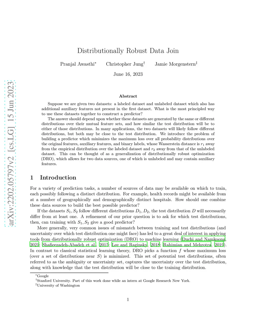 Suppose we are given two datasets: a labeled dataset and unlabeled dataset which also has additional auxiliary features not present in the first dataset. What is the most principled way to use these datasets together to construct a predictor? The answer should depend upon whether these datasets are generated by the same or different distributions over their mutual feature sets, and how similar the test distribution will be to either of those distributions. In many applications, the two datasets will likely follow different distributions, but both may be close to the test distribution. We introduce the problem of building a predictor which minimizes the maximum loss over all probability distributions over the original features, auxiliary features, and binary labels, whose Wasserstein distance is away from the empirical distribution over the labeled dataset and away from that of the unlabeled dataset. This can be thought of as a generalization of distributionally robust optimization (DRO), which allows for two data sources, one of which is unlabeled and may contain auxiliary features.