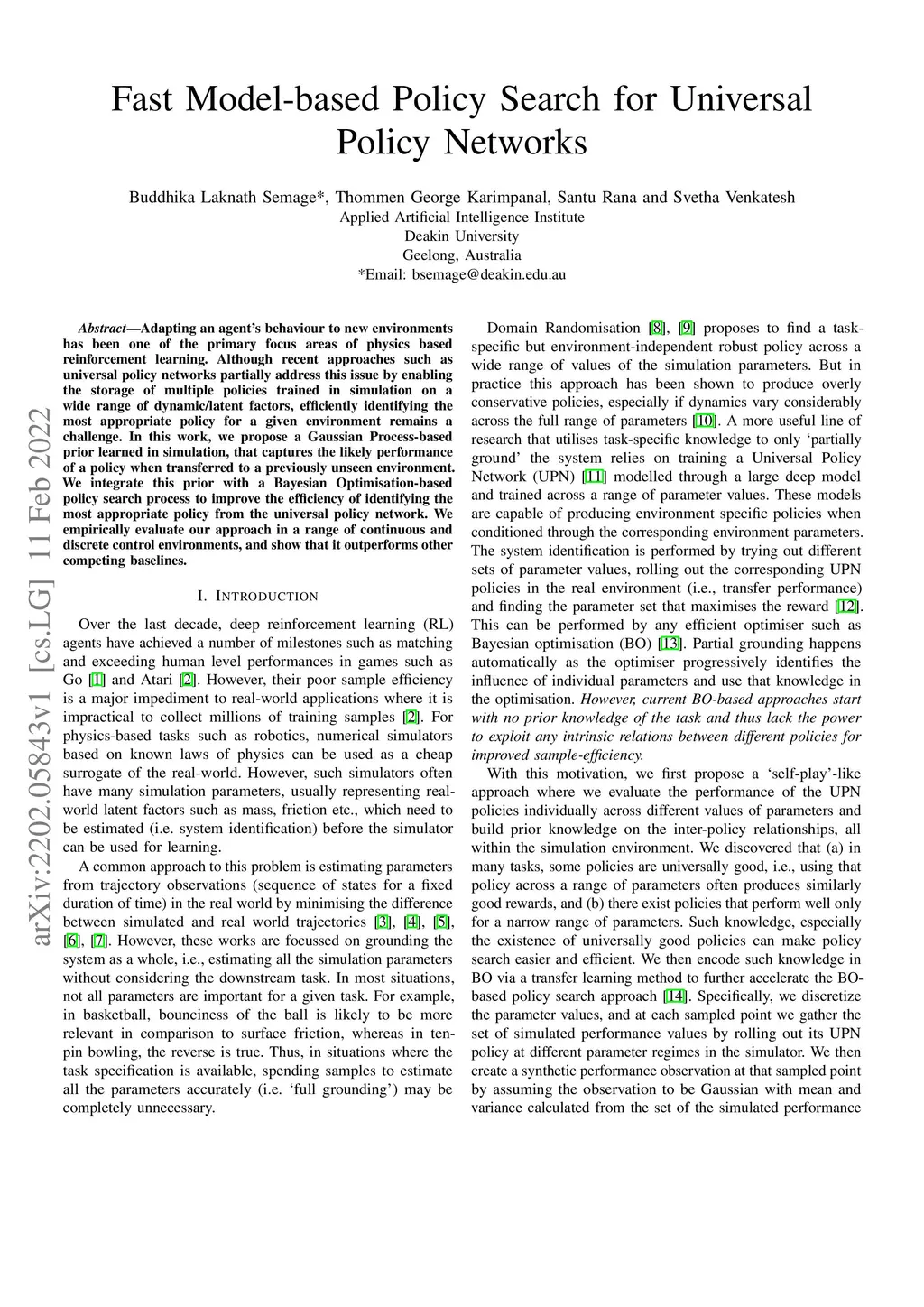 Adapting an agent's behaviour to new environments has been one of the primary focus areas of physics based reinforcement learning. Although recent approaches such as universal policy networks partially address this issue by enabling the storage of multiple policies trained in simulation on a wide range of dynamic/latent factors, efficiently identifying the most appropriate policy for a given environment remains a challenge. In this work, we propose a Gaussian Process-based prior learned in simulation, that captures the likely performance of a policy when transferred to a previously unseen environment. We integrate this prior with a Bayesian Optimisation-based policy search process to improve the efficiency of identifying the most appropriate policy from the universal policy network. We empirically evaluate our approach in a range of continuous and discrete control environments, and show that it outperforms other competing baselines.