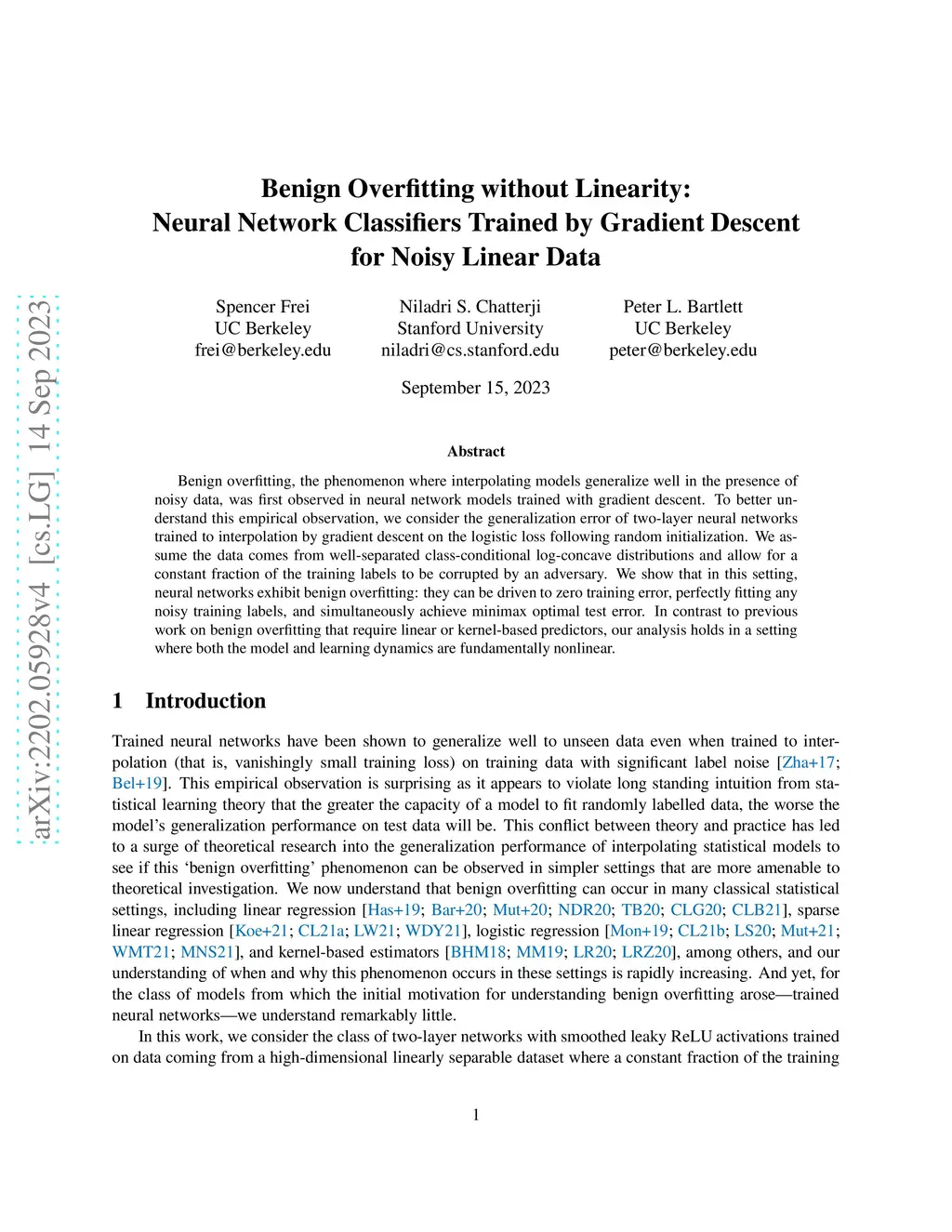 Benign overfitting, the phenomenon where interpolating models generalize well in the presence of noisy data, was first observed in neural network models trained with gradient descent. To better understand this empirical observation, we consider the generalization error of two-layer neural networks trained to interpolation by gradient descent on the logistic loss following random initialization. We assume the data comes from well-separated class-conditional log-concave distributions and allow for a constant fraction of the training labels to be corrupted by an adversary. We show that in this setting, neural networks exhibit benign overfitting: they can be driven to zero training error, perfectly fitting any noisy training labels, and simultaneously achieve minimax optimal test error. In contrast to previous work on benign overfitting that require linear or kernel-based predictors, our analysis holds in a setting where both the model and learning dynamics are fundamentally nonlinear.