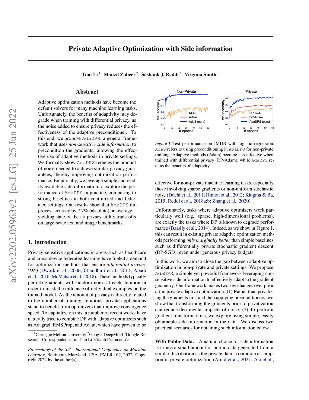 Adaptive optimization methods have become the default solvers for many machine learning tasks. Unfortunately, the benefits of adaptivity may degrade when training with differential privacy, as the noise added to ensure privacy reduces the effectiveness of the adaptive preconditioner. To this end, we propose AdaDPS, a general framework that uses non-sensitive side information to precondition the gradients, allowing the effective use of adaptive methods in private settings. We formally show AdaDPS reduces the amount of noise needed to achieve similar privacy guarantees, thereby improving optimization performance. Empirically, we leverage simple and readily available side information to explore the performance of AdaDPS in practice, comparing to strong baselines in both centralized and federated settings. Our results show that AdaDPS improves accuracy by 7.7% (absolute) on average -- yielding state-of-the-art privacy-utility trade-offs on large-scale text and image benchmarks.