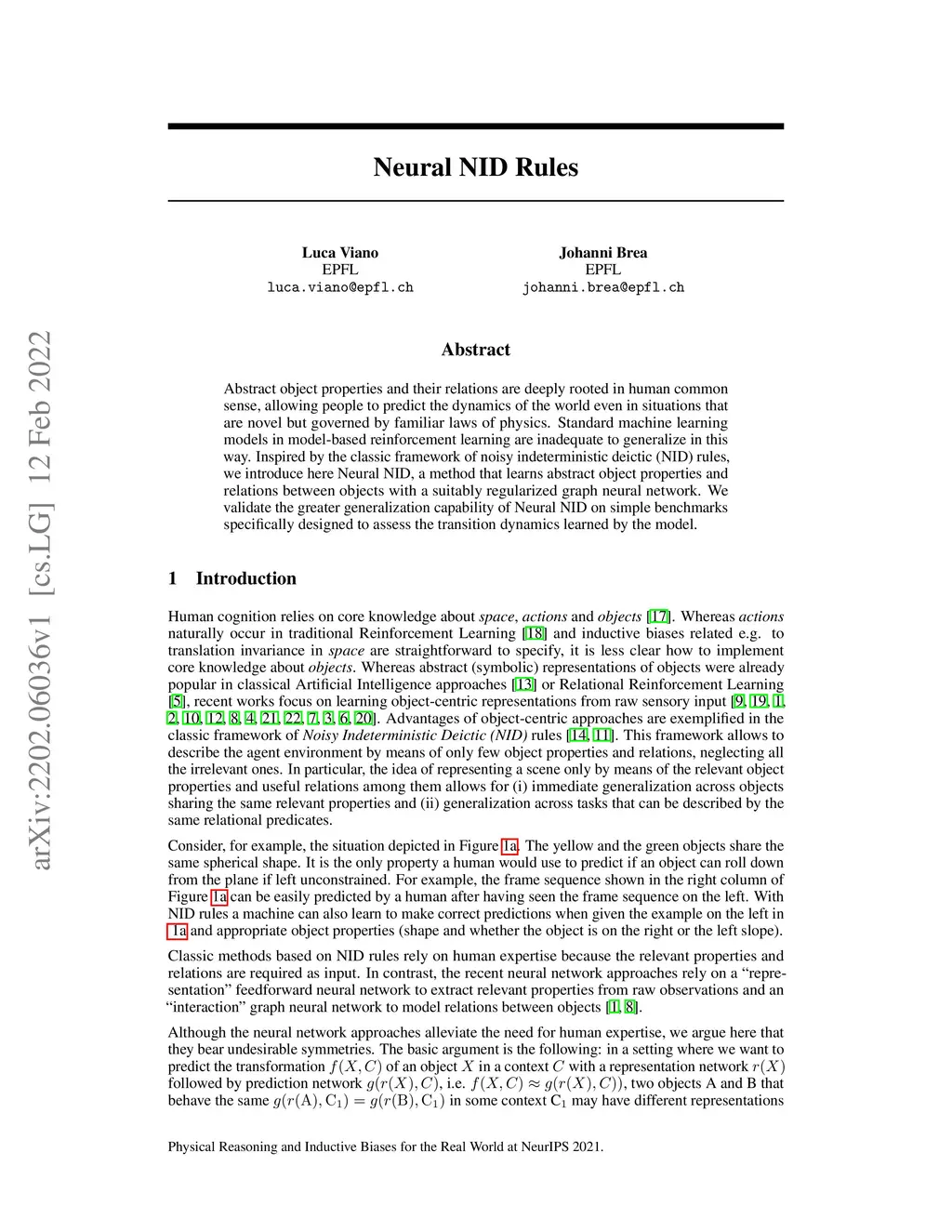 Abstract object properties and their relations are deeply rooted in human common sense, allowing people to predict the dynamics of the world even in situations that are novel but governed by familiar laws of physics. Standard machine learning models in model-based reinforcement learning are inadequate to generalize in this way. Inspired by the classic framework of noisy indeterministic deictic (NID) rules, we introduce here Neural NID, a method that learns abstract object properties and relations between objects with a suitably regularized graph neural network. We validate the greater generalization capability of Neural NID on simple benchmarks specifically designed to assess the transition dynamics learned by the model.
