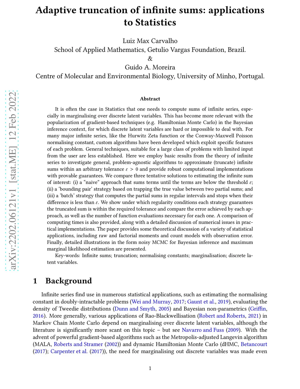 It is often the case in Statistics that one needs to compute sums of infinite series, especially in marginalising over discrete latent variables. This has become more relevant with the popularization of gradient-based techniques (e.g. Hamiltonian Monte Carlo) in the Bayesian inference context, for which discrete latent variables are hard or impossible to deal with. For many commonly used infinite series, custom algorithms have been developed which exploit specific features of each problem. General techniques, suitable for a large class of problems with limited input from the user are less established. We employ basic results from the theory of infinite series to investigate general, problem-agnostic algorithms to truncate infinite sums within an arbitrary tolerance and provide robust computational implementations with provable guarantees. We compare three tentative solutions to estimating the infinite sum of interest: (i) a "naive" approach that sums terms until the terms are below the threshold ; (ii) a `bounding pair' strategy based on trapping the true value between two partial sums; and (iii) a `batch' strategy that computes the partial sums in regular intervals and stops when their difference is less than . We show under which conditions each strategy guarantees the truncated sum is within the required tolerance and compare the error achieved by each approach, as well as the number of function evaluations necessary for each one. A detailed discussion of numerical issues in practical implementations is also provided. The paper provides some theoretical discussion of a variety of statistical applications, including raw and factorial moments and count models with observation error. Finally, detailed illustrations in the form noisy MCMC for Bayesian inference and maximum marginal likelihood estimation are presented.