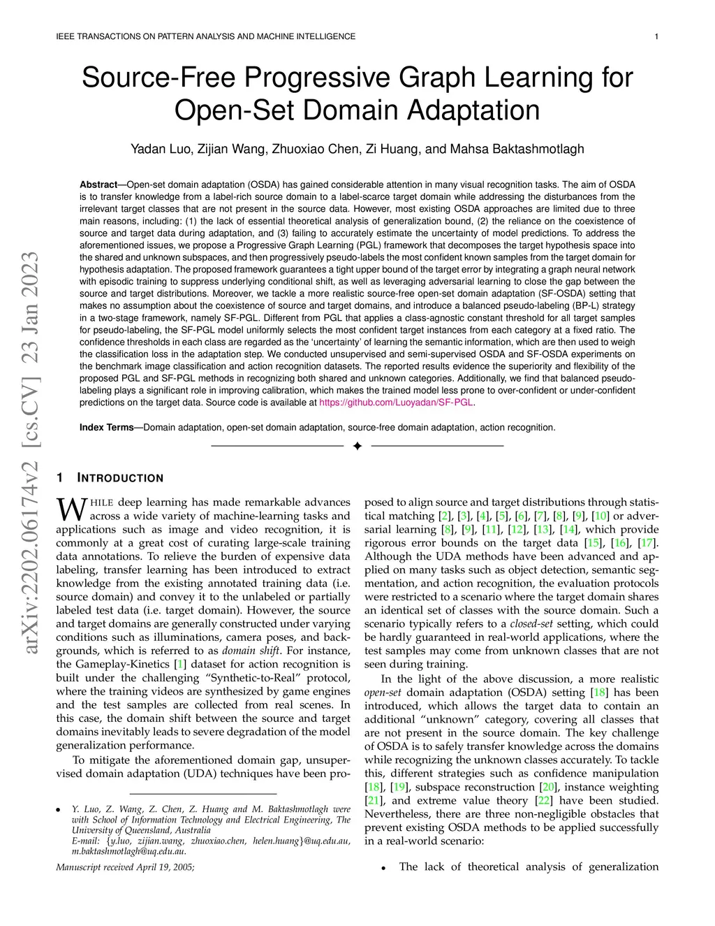 Open-set domain adaptation (OSDA) has gained considerable attention in many visual recognition tasks. However, most existing OSDA approaches are limited due to three main reasons, including: (1) the lack of essential theoretical analysis of generalization bound, (2) the reliance on the coexistence of source and target data during adaptation, and (3) failing to accurately estimate the uncertainty of model predictions. We propose a Progressive Graph Learning (PGL) framework that decomposes the target hypothesis space into the shared and unknown subspaces, and then progressively pseudo-labels the most confident known samples from the target domain for hypothesis adaptation. Moreover, we tackle a more realistic source-free open-set domain adaptation (SF-OSDA) setting that makes no assumption about the coexistence of source and target domains, and introduce a balanced pseudo-labeling (BP-L) strategy in a two-stage framework, namely SF-PGL. Different from PGL that applies a class-agnostic constant threshold for all target samples for pseudo-labeling, the SF-PGL model uniformly selects the most confident target instances from each category at a fixed ratio. The confidence thresholds in each class are regarded as the úncertainty' of learning the semantic information, which are then used to weigh the classification loss in the adaptation step. We conducted unsupervised and semi-supervised OSDA and SF-OSDA experiments on the benchmark image classification and action recognition datasets. Additionally, we find that balanced pseudo-labeling plays a significant role in improving calibration, which makes the trained model less prone to over-confident or under-confident predictions on the target data. Source code is available at https://github.com/Luoyadan/SF-PGL.