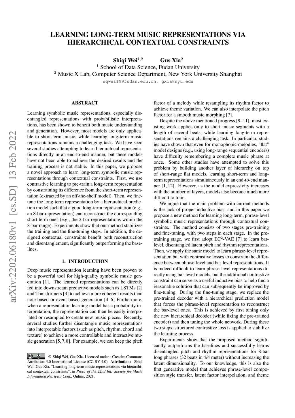 Learning symbolic music representations, especially disentangled representations with probabilistic interpretations, has been shown to benefit both music understanding and generation. However, most models are only applicable to short-term music, while learning long-term music representations remains a challenging task. We have seen several studies attempting to learn hierarchical representations directly in an end-to-end manner, but these models have not been able to achieve the desired results and the training process is not stable. In this paper, we propose a novel approach to learn long-term symbolic music representations through contextual constraints. First, we use contrastive learning to pre-train a long-term representation by constraining its difference from the short-term representation (extracted by an off-the-shelf model). Then, we fine-tune the long-term representation by a hierarchical prediction model such that a good long-term representation (e.g., an 8-bar representation) can reconstruct the corresponding short-term ones (e.g., the 2-bar representations within the 8-bar range). Experiments show that our method stabilizes the training and the fine-tuning steps. In addition, the designed contextual constraints benefit both reconstruction and disentanglement, significantly outperforming the baselines.