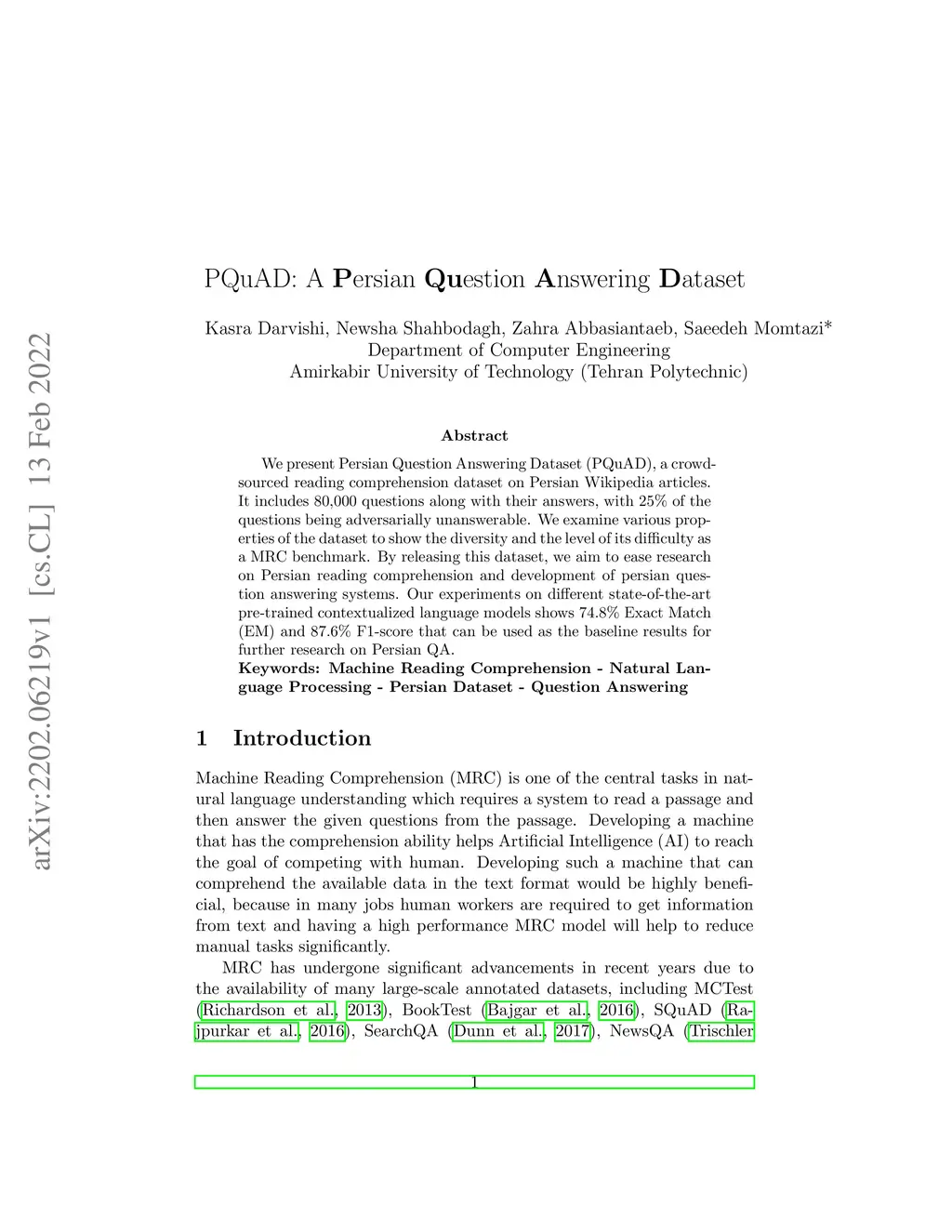 We present Persian Question Answering Dataset (PQuAD), a crowdsourced reading comprehension dataset on Persian Wikipedia articles. It includes 80,000 questions along with their answers, with 25% of the questions being adversarially unanswerable. We examine various properties of the dataset to show the diversity and the level of its difficulty as an MRC benchmark. By releasing this dataset, we aim to ease research on Persian reading comprehension and development of Persian question answering systems. Our experiments on different state-of-the-art pre-trained contextualized language models show 74.8% Exact Match (EM) and 87.6% F1-score that can be used as the baseline results for further research on Persian QA.