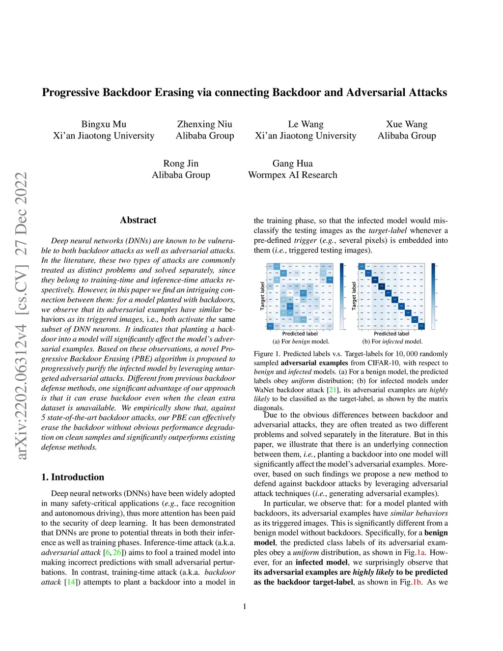 Deep neural networks (DNNs) are known to be vulnerable to both backdoor attacks as well as adversarial attacks. In the literature, these two types of attacks are commonly treated as distinct problems and solved separately, since they belong to training-time and inference-time attacks respectively. However, in this paper we find an intriguing connection between them: for a model planted with backdoors, we observe that its adversarial examples have similar behaviors as its triggered images, i.e., both activate the same subset of DNN neurons. It indicates that planting a backdoor into a model will significantly affect the model's adversarial examples. Based on these observations, a novel Progressive Backdoor Erasing (PBE) algorithm is proposed to progressively purify the infected model by leveraging untargeted adversarial attacks. Different from previous backdoor defense methods, one significant advantage of our approach is that it can erase backdoor even when the clean extra dataset is unavailable. We empirically show that, against 5 state-of-the-art backdoor attacks, our PBE can effectively erase the backdoor without obvious performance degradation on clean samples and significantly outperforms existing defense methods.