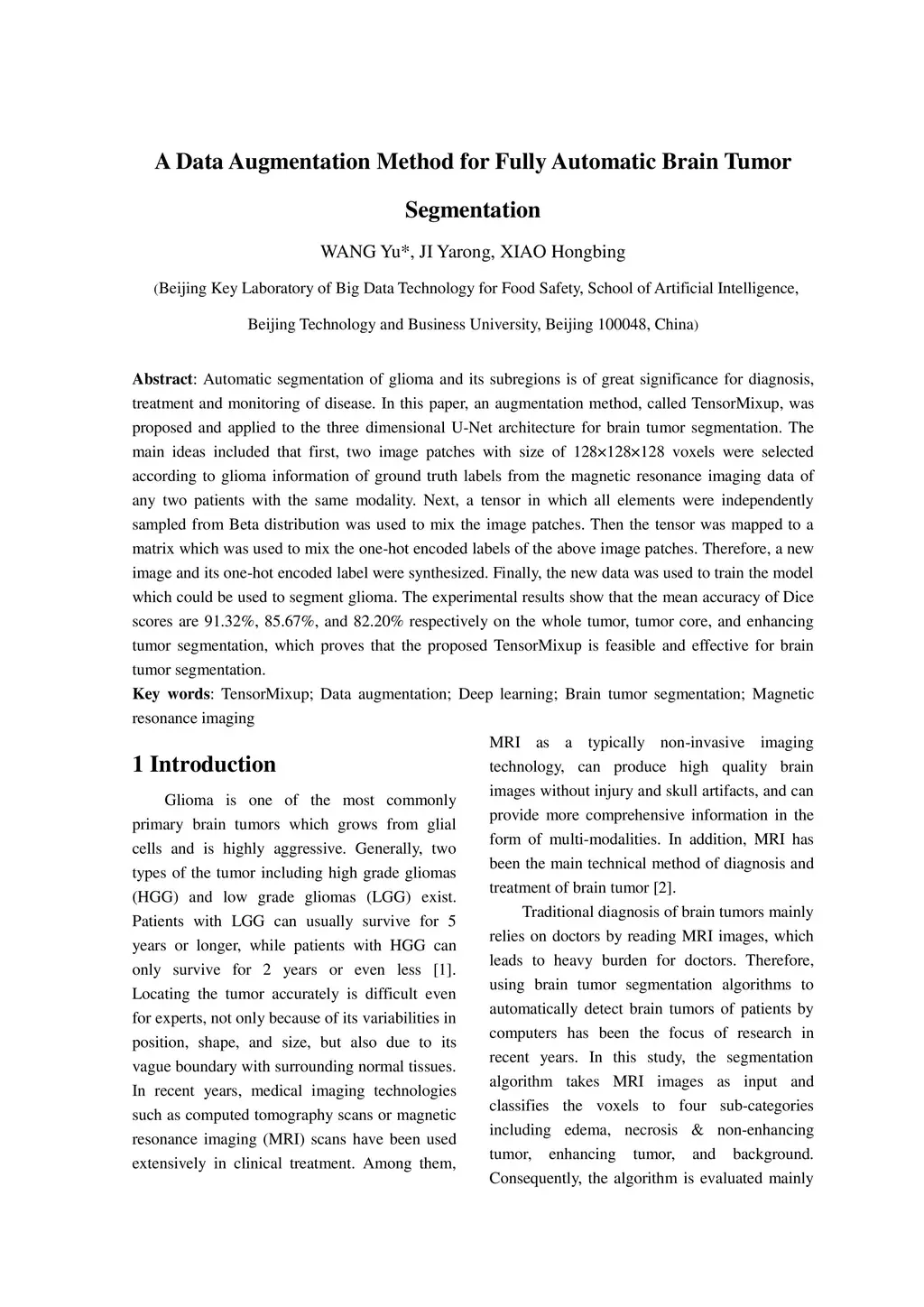 Automatic segmentation of glioma and its subregions is of great significance for diagnosis, treatment and monitoring of disease. In this paper, an augmentation method, called TensorMixup, was proposed and applied to the three dimensional U-Net architecture for brain tumor segmentation. The main ideas included that first, two image patches with size of 128 in three dimensions were selected according to glioma information of ground truth labels from the magnetic resonance imaging data of any two patients with the same modality. Next, a tensor in which all elements were independently sampled from Beta distribution was used to mix the image patches. Then the tensor was mapped to a matrix which was used to mix the one-hot encoded labels of the above image patches. Therefore, a new image and its one-hot encoded label were synthesized. Finally, the new data was used to train the model which could be used to segment glioma. The experimental results show that the mean accuracy of Dice scores are 91.32%, 85.67%, and 82.20% respectively on the whole tumor, tumor core, and enhancing tumor segmentation, which proves that the proposed TensorMixup is feasible and effective for brain tumor segmentation.