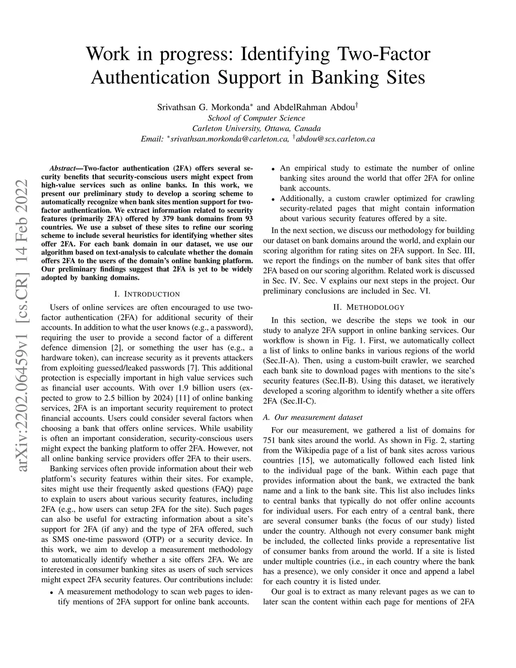 Two-factor authentication (2FA) offers several security benefits that security-conscious users might expect from high-value services such as online banks. In this work, we present our preliminary study to develop a scoring scheme to automatically recognize when bank sites mention support for two-factor authentication. We extract information related to security features (primarily 2FA) offered by 379 bank domains from 93 countries. We use a subset of these sites to refine our scoring scheme to include several heuristics for identifying whether sites offer 2FA. For each bank domain in our dataset, we use our algorithm based on text-analysis to calculate whether the domain offers 2FA to the users of the domain's online banking platform. Our preliminary findings suggest that 2FA is yet to be widely adopted by banking domains.