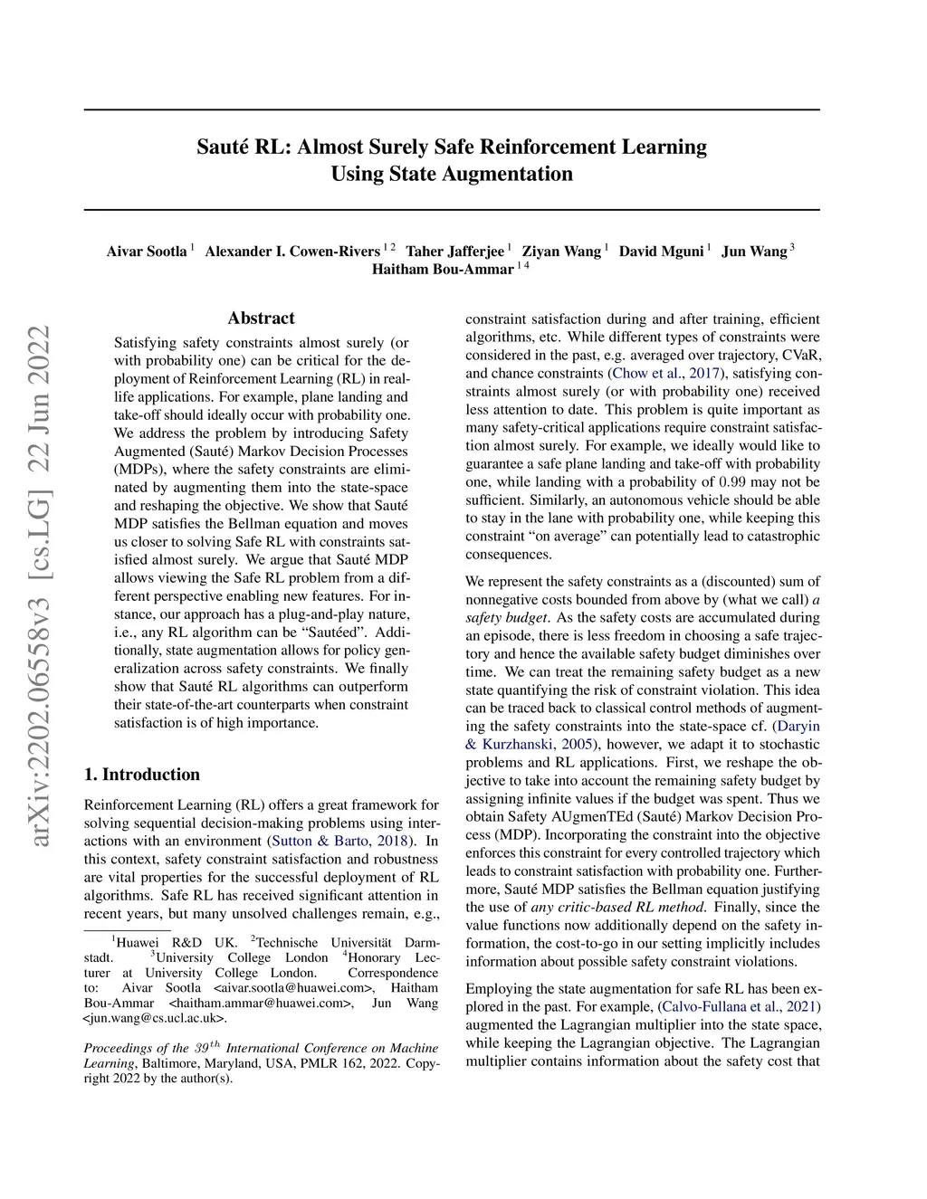 Satisfying safety constraints almost surely (or with probability one) can be critical for the deployment of Reinforcement Learning (RL) in real-life applications. For example, plane landing and take-off should ideally occur with probability one. We address the problem by introducing Safety Augmented (Saute) Markov Decision Processes (MDPs), where the safety constraints are eliminated by augmenting them into the state-space and reshaping the objective. We show that Saute MDP satisfies the Bellman equation and moves us closer to solving Safe RL with constraints satisfied almost surely. We argue that Saute MDP allows viewing the Safe RL problem from a different perspective enabling new features. For instance, our approach has a plug-and-play nature, i.e., any RL algorithm can be "Sauteed". Additionally, state augmentation allows for policy generalization across safety constraints. We finally show that Saute RL algorithms can outperform their state-of-the-art counterparts when constraint satisfaction is of high importance.
