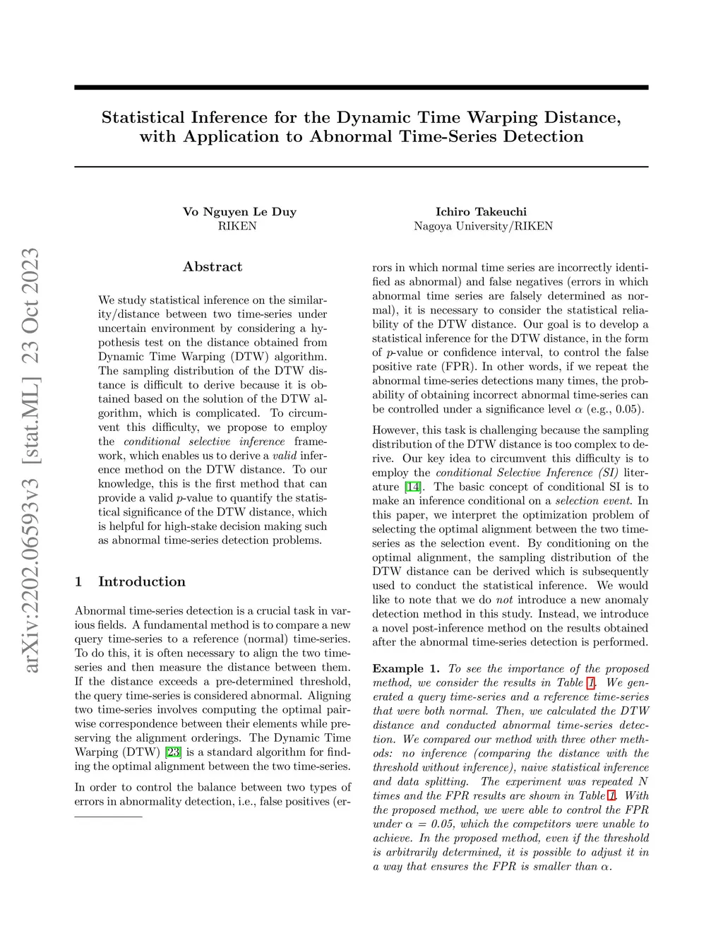 We study statistical inference on the similarity/distance between two time-series under uncertain environment by considering a statistical hypothesis test on the distance obtained from Dynamic Time Warping (DTW) algorithm. The sampling distribution of the DTW distance is too difficult to derive because it is obtained based on the solution of the DTW algorithm, which is complicated. To circumvent this difficulty, we propose to employ the conditional selective inference framework, which enables us to derive a valid inference method on the DTW distance. To our knowledge, this is the first method that can provide a valid p-value to quantify the statistical significance of the DTW distance, which is helpful for high-stake decision making such as abnormal time-series detection problems. We evaluate the performance of the proposed inference method on both synthetic and real-world datasets.