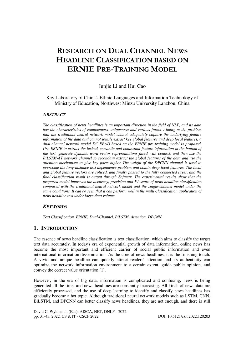 Research on Dual Channel News Headline Classification Based on ERNIE