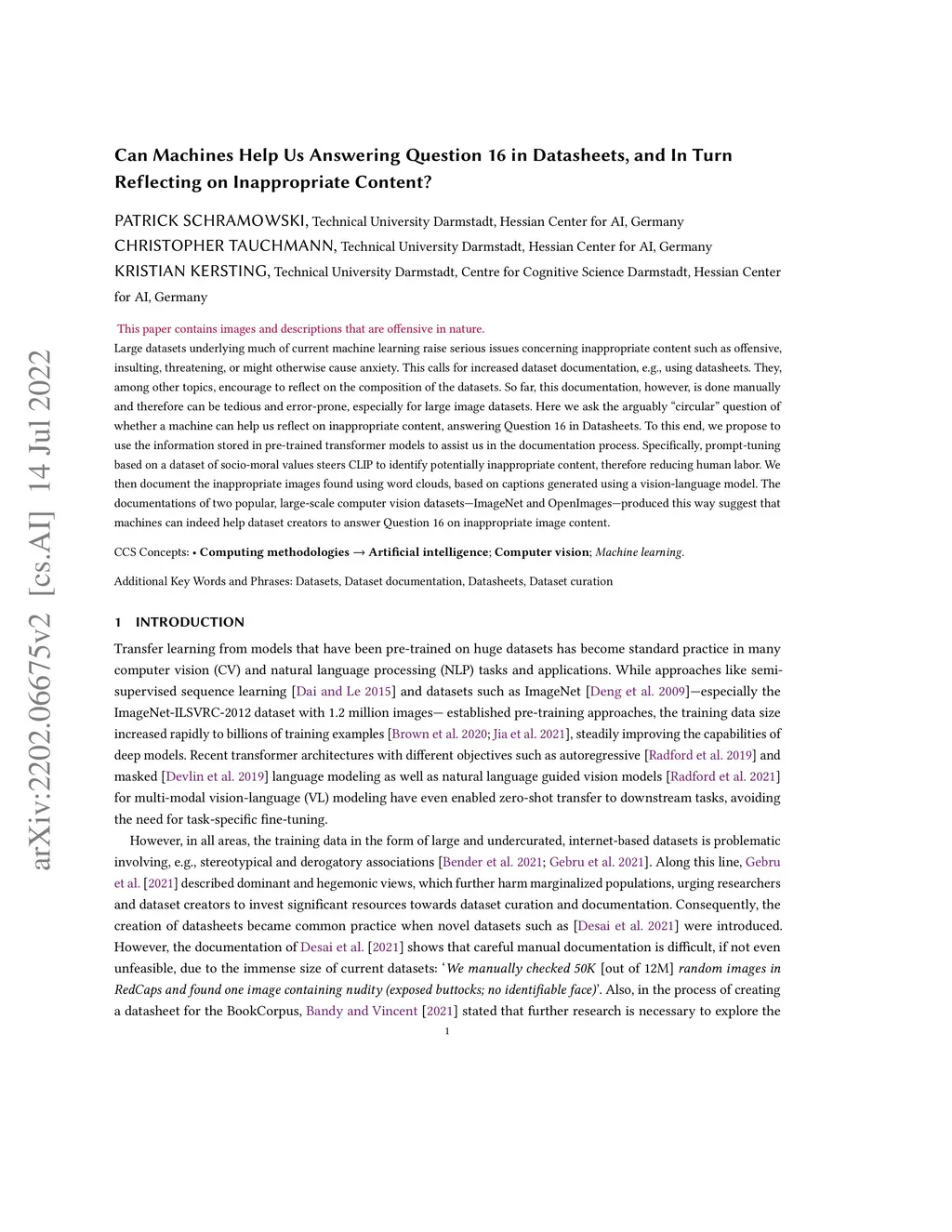 Large datasets underlying much of current machine learning raise serious issues concerning inappropriate content such as offensive, insulting, threatening, or might otherwise cause anxiety. This calls for increased dataset documentation, e.g., using datasheets. They, among other topics, encourage to reflect on the composition of the datasets. So far, this documentation, however, is done manually and therefore can be tedious and error-prone, especially for large image datasets. Here we ask the arguably "circular" question of whether a machine can help us reflect on inappropriate content, answering Question 16 in Datasheets. To this end, we propose to use the information stored in pre-trained transformer models to assist us in the documentation process. Specifically, prompt-tuning based on a dataset of socio-moral values steers CLIP to identify potentially inappropriate content, therefore reducing human labor. We then document the inappropriate images found using word clouds, based on captions generated using a vision-language model. The documentations of two popular, large-scale computer vision datasets -- ImageNet and OpenImages -- produced this way suggest that machines can indeed help dataset creators to answer Question 16 on inappropriate image content.