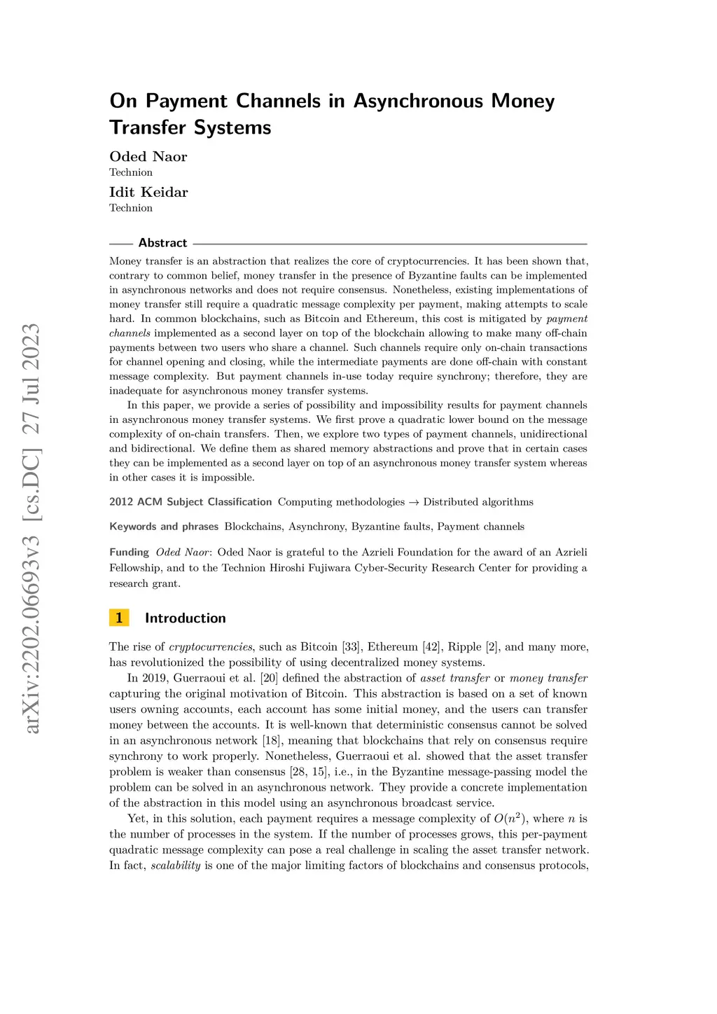Money transfer is an abstraction that realizes the core of cryptocurrencies. It has been shown that, contrary to common belief, money transfer in the presence of Byzantine faults can be implemented in asynchronous networks and does not require consensus. Nonetheless, existing implementations of money transfer still require a quadratic message complexity per payment, making attempts to scale hard. In common blockchains, such as Bitcoin and Ethereum, this cost is mitigated by payment channels implemented as a second layer on top of the blockchain allowing to make many off-chain payments between two users who share a channel. Such channels only require on-chain transactions for channel opening and closing, while the intermediate payments are done off-chain with constant message complexity. But payment channels in-use today require synchrony, therefore they are inadequate for asynchronous money transfer systems. In this paper, we provide a series of possibility and impossibility results for payment channels in asynchronous money transfer systems. We first prove a quadratic lower bound on the message complexity of on-chain transfers. Then, we explore two types of payment channels, unidirectional and bidirectional. We define them as shared memory abstractions and prove that in certain cases they can be implemented as a second layer on top of an asynchronous money transfer system whereas in other cases it is impossible.