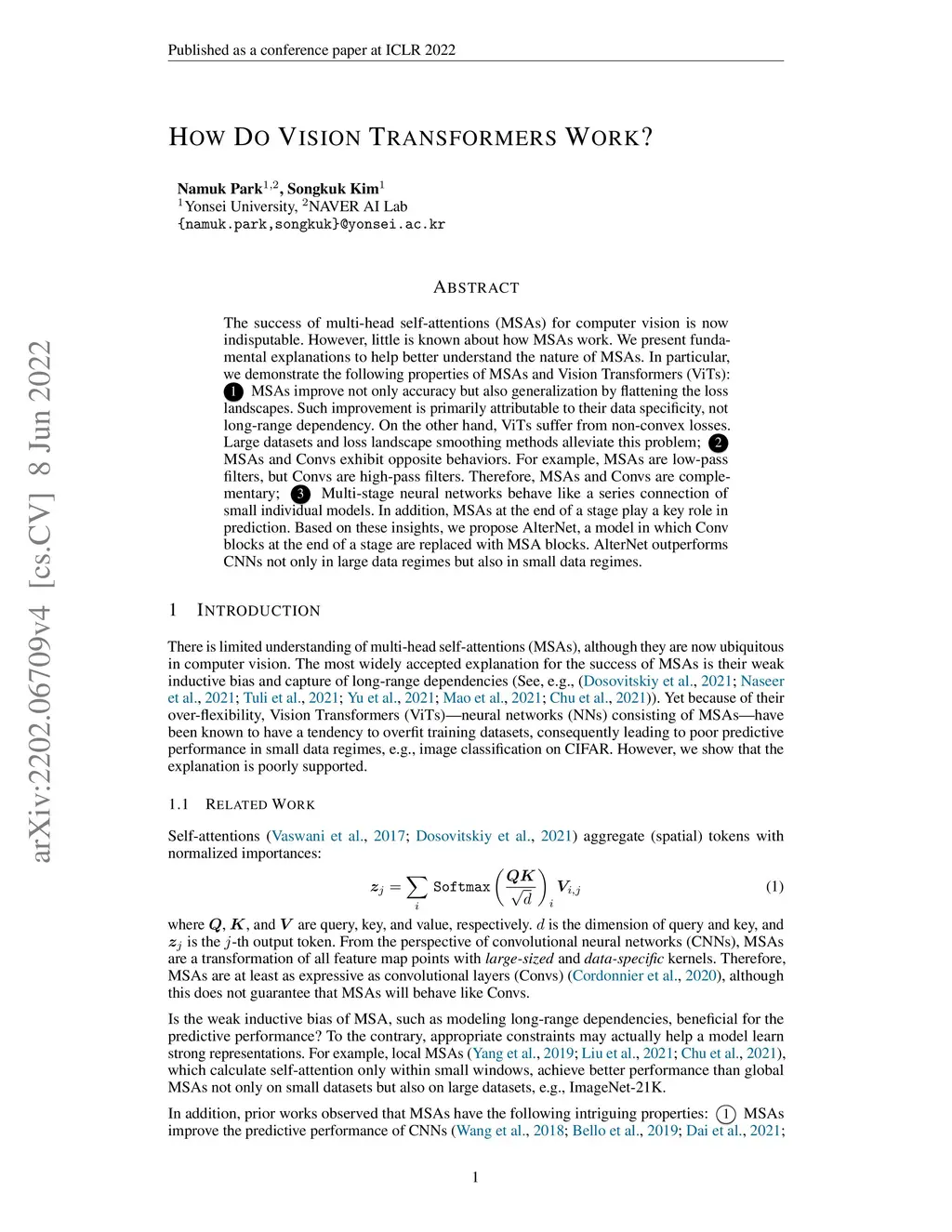 The success of multi-head self-attentions (MSAs) for computer vision is now indisputable. However, little is known about how MSAs work. We present fundamental explanations to help better understand the nature of MSAs. In particular, we demonstrate the following properties of MSAs and Vision Transformers (ViTs): (1) MSAs improve not only accuracy but also generalization by flattening the loss landscapes. Such improvement is primarily attributable to their data specificity, not long-range dependency. On the other hand, ViTs suffer from non-convex losses. Large datasets and loss landscape smoothing methods alleviate this problem; (2) MSAs and Convs exhibit opposite behaviors. For example, MSAs are low-pass filters, but Convs are high-pass filters. Therefore, MSAs and Convs are complementary; (3) Multi-stage neural networks behave like a series connection of small individual models. In addition, MSAs at the end of a stage play a key role in prediction. Based on these insights, we propose AlterNet, a model in which Conv blocks at the end of a stage are replaced with MSA blocks. AlterNet outperforms CNNs not only in large data regimes but also in small data regimes. The code is available at https://github.com/xxxnell/how-do-vits-work.