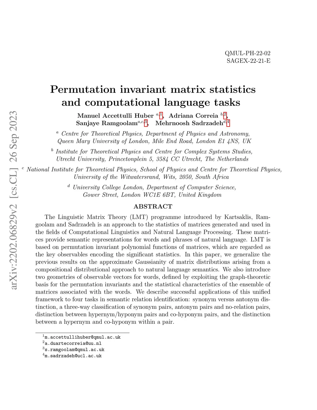 The Linguistic Matrix Theory programme introduced by Kartsaklis, Ramgoolam and Sadrzadeh is an approach to the statistics of matrices that are generated in type-driven distributional semantics, based on permutation invariant polynomial functions which are regarded as the key observables encoding the significant statistics. In this paper we generalize the previous results on the approximate Gaussianity of matrix distributions arising from compositional distributional semantics. We also introduce a geometry of observable vectors for words, defined by exploiting the graph-theoretic basis for the permutation invariants and the statistical characteristics of the ensemble of matrices associated with the words. We describe successful applications of this unified framework to a number of tasks in computational linguistics, associated with the distinctions between synonyms, antonyms, hypernyms and hyponyms.