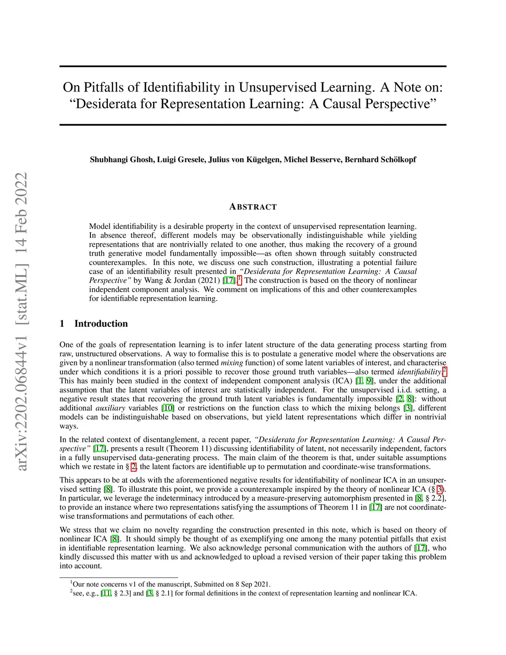 Model identifiability is a desirable property in the context of unsupervised representation learning. In absence thereof, different models may be observationally indistinguishable while yielding representations that are nontrivially related to one another, thus making the recovery of a ground truth generative model fundamentally impossible, as often shown through suitably constructed counterexamples. In this note, we discuss one such construction, illustrating a potential failure case of an identifiability result presented in "Desiderata for Representation Learning: A Causal Perspective" by Wang & Jordan (2021). The construction is based on the theory of nonlinear independent component analysis. We comment on implications of this and other counterexamples for identifiable representation learning.
