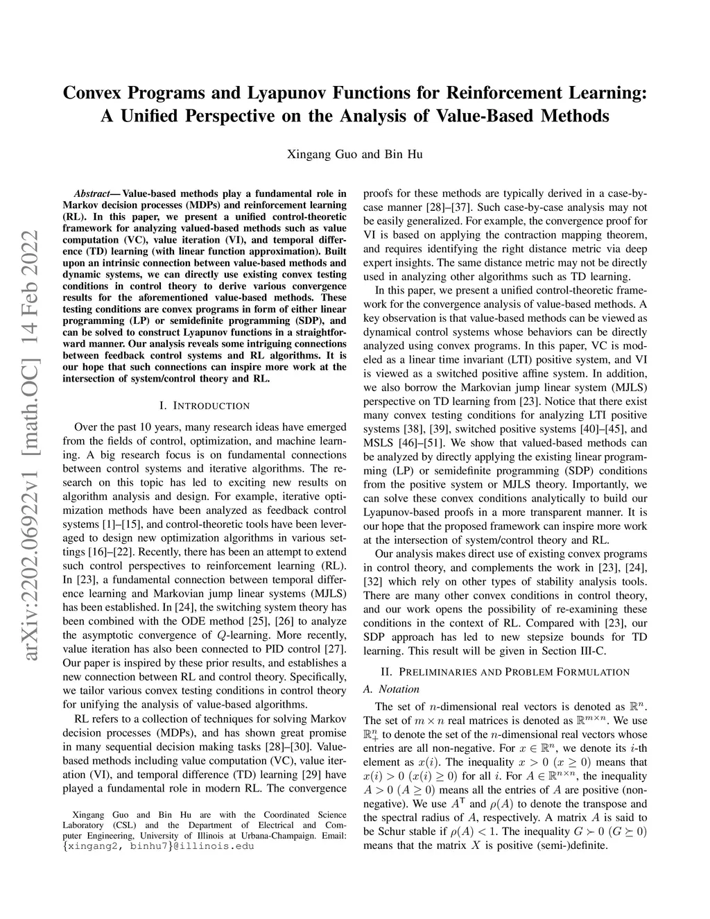 Value-based methods play a fundamental role in Markov decision processes (MDPs) and reinforcement learning (RL). In this paper, we present a unified control-theoretic framework for analyzing valued-based methods such as value computation (VC), value iteration (VI), and temporal difference (TD) learning (with linear function approximation). Built upon an intrinsic connection between value-based methods and dynamic systems, we can directly use existing convex testing conditions in control theory to derive various convergence results for the aforementioned value-based methods. These testing conditions are convex programs in form of either linear programming (LP) or semidefinite programming (SDP), and can be solved to construct Lyapunov functions in a straightforward manner. Our analysis reveals some intriguing connections between feedback control systems and RL algorithms. It is our hope that such connections can inspire more work at the intersection of system/control theory and RL.