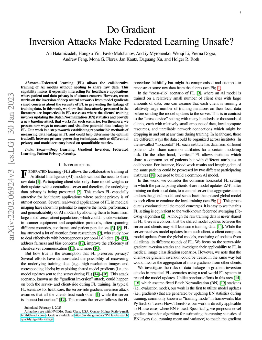 Federated learning (FL) allows the collaborative training of AI models without needing to share raw data. This capability makes it especially interesting for healthcare applications where patient and data privacy is of utmost concern. However, recent works on the inversion of deep neural networks from model gradients raised concerns about the security of FL in preventing the leakage of training data. In this work, we show that these attacks presented in the literature are impractical in FL use-cases where the clients' training involves updating the Batch Normalization (BN) statistics and provide a new baseline attack that works for such scenarios. Furthermore, we present new ways to measure and visualize potential data leakage in FL. Our work is a step towards establishing reproducible methods of measuring data leakage in FL and could help determine the optimal tradeoffs between privacy-preserving techniques, such as differential privacy, and model accuracy based on quantifiable metrics. Code is available at https://nvidia.github.io/NVFlare/research/quantifying-data-leakage.