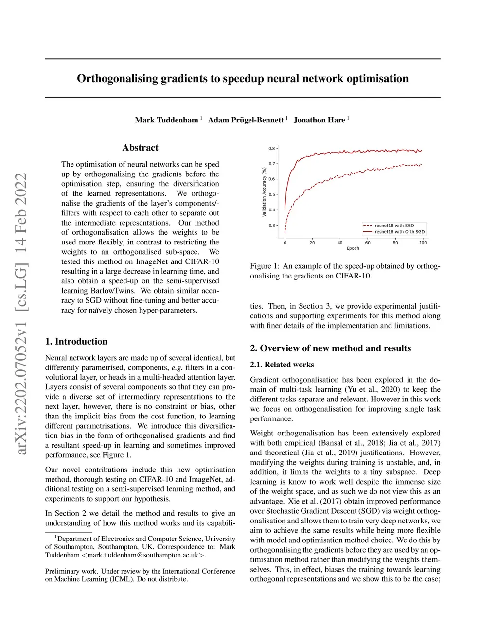 The optimisation of neural networks can be sped up by orthogonalising the gradients before the optimisation step, ensuring the diversification of the learned representations. We orthogonalise the gradients of the layer's components/filters with respect to each other to separate out the intermediate representations. Our method of orthogonalisation allows the weights to be used more flexibly, in contrast to restricting the weights to an orthogonalised sub-space. We tested this method on ImageNet and CIFAR-10 resulting in a large decrease in learning time, and also obtain a speed-up on the semi-supervised learning BarlowTwins. We obtain similar accuracy to SGD without fine-tuning and better accuracy for na\"ively chosen hyper-parameters.