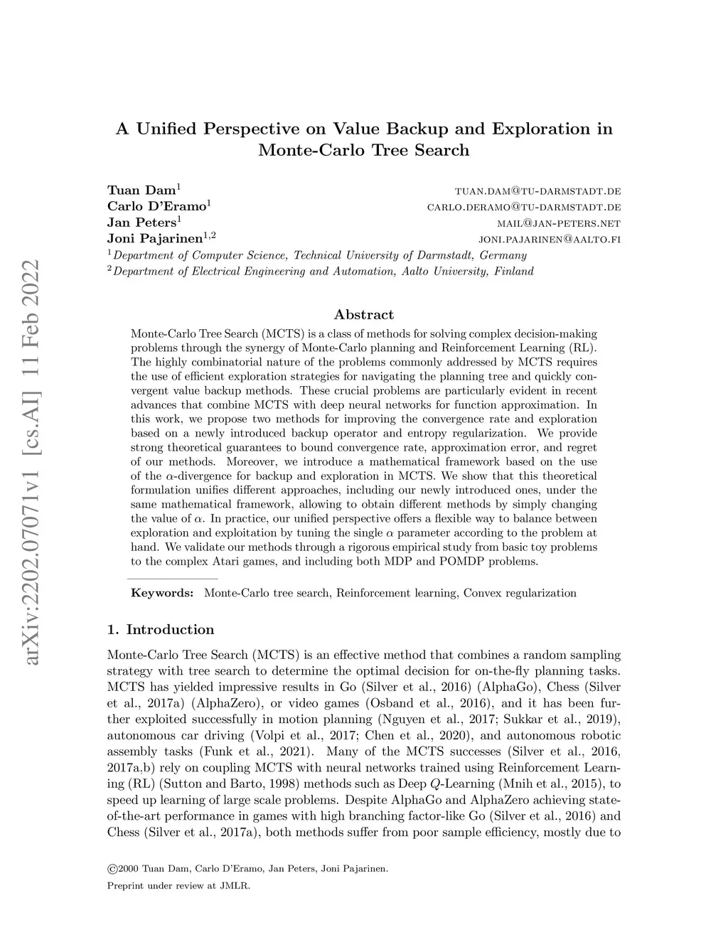 Monte-Carlo Tree Search (MCTS) is a class of methods for solving complex decision-making problems through the synergy of Monte-Carlo planning and Reinforcement Learning (RL). The highly combinatorial nature of the problems commonly addressed by MCTS requires the use of efficient exploration strategies for navigating the planning tree and quickly convergent value backup methods. These crucial problems are particularly evident in recent advances that combine MCTS with deep neural networks for function approximation. In this work, we propose two methods for improving the convergence rate and exploration based on a newly introduced backup operator and entropy regularization. We provide strong theoretical guarantees to bound convergence rate, approximation error, and regret of our methods. Moreover, we introduce a mathematical framework based on the use of the -divergence for backup and exploration in MCTS. We show that this theoretical formulation unifies different approaches, including our newly introduced ones, under the same mathematical framework, allowing to obtain different methods by simply changing the value of . In practice, our unified perspective offers a flexible way to balance between exploration and exploitation by tuning the single parameter according to the problem at hand. We validate our methods through a rigorous empirical study from basic toy problems to the complex Atari games, and including both MDP and POMDP problems.