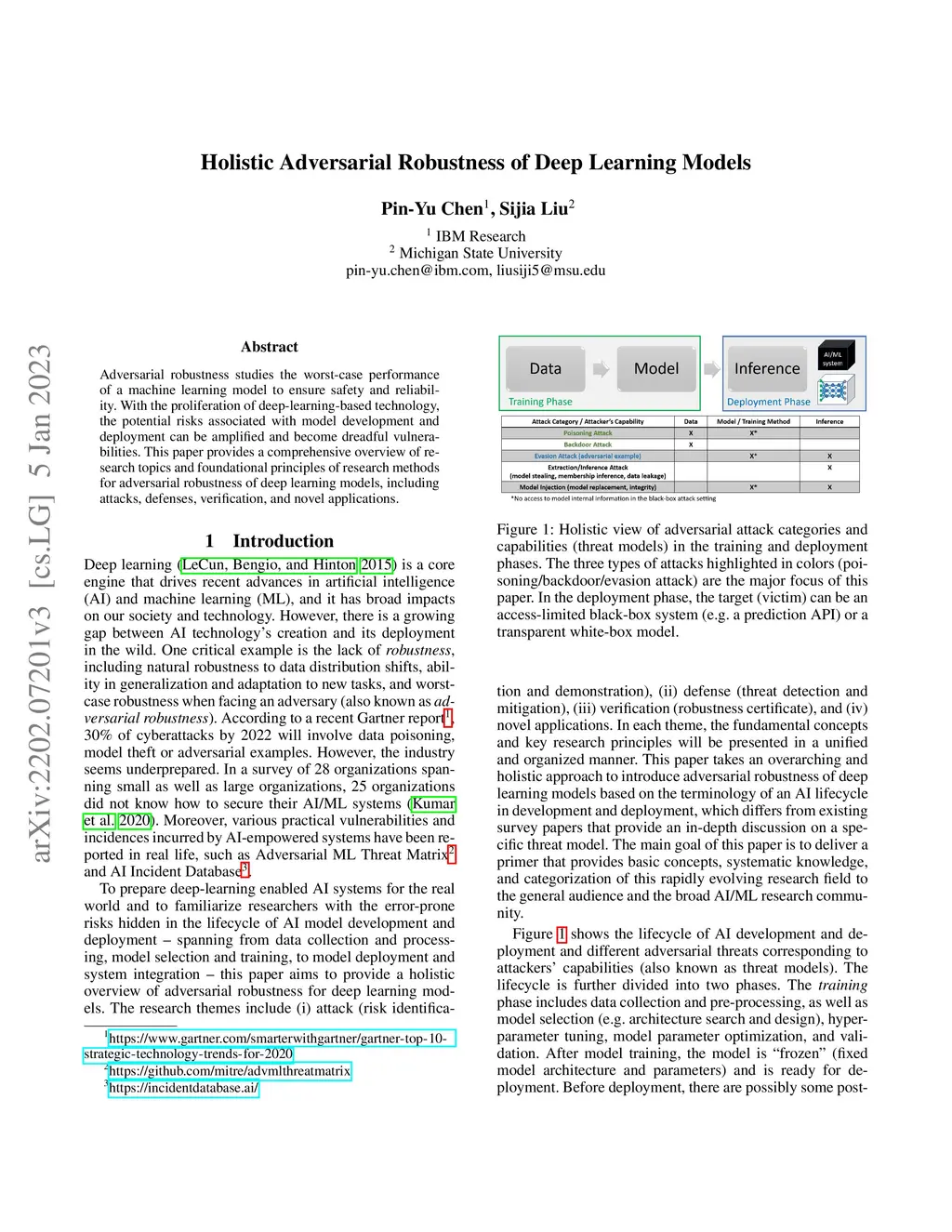 Adversarial robustness studies the worst-case performance of a machine learning model to ensure safety and reliability. With the proliferation of deep-learning-based technology, the potential risks associated with model development and deployment can be amplified and become dreadful vulnerabilities. This paper provides a comprehensive overview of research topics and foundational principles of research methods for adversarial robustness of deep learning models, including attacks, defenses, verification, and novel applications.