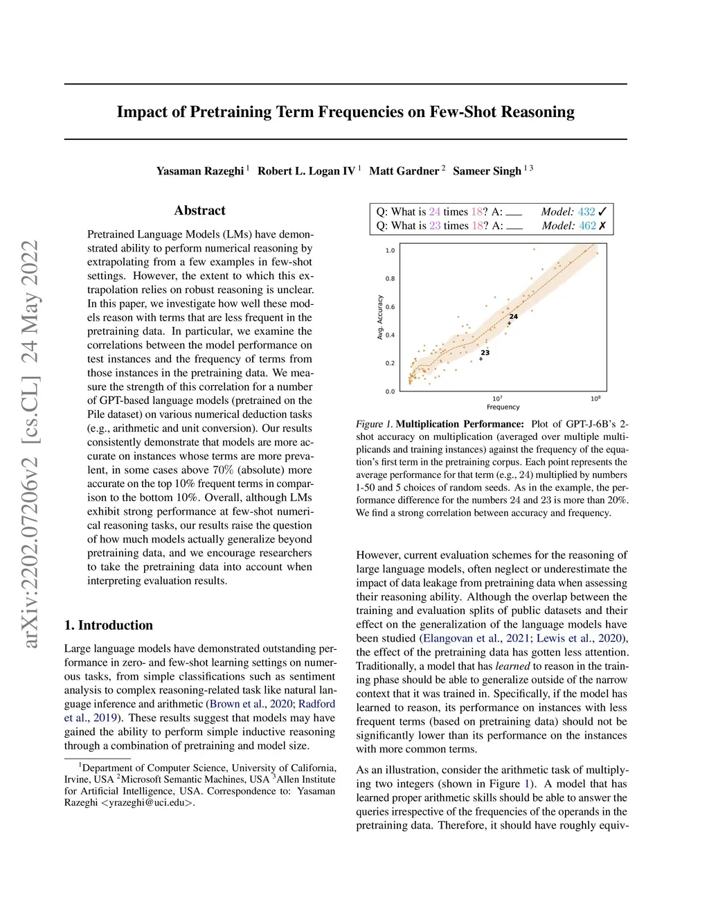 Pretrained Language Models (LMs) have demonstrated ability to perform numerical reasoning by extrapolating from a few examples in few-shot settings. However, the extent to which this extrapolation relies on robust reasoning is unclear. In this paper, we investigate how well these models reason with terms that are less frequent in the pretraining data. In particular, we examine the correlations between the model performance on test instances and the frequency of terms from those instances in the pretraining data. We measure the strength of this correlation for a number of GPT-based language models (pretrained on the Pile dataset) on various numerical deduction tasks (e.g., arithmetic and unit conversion). Our results consistently demonstrate that models are more accurate on instances whose terms are more prevalent, in some cases above (absolute) more accurate on the top 10\% frequent terms in comparison to the bottom 10\%. Overall, although LMs exhibit strong performance at few-shot numerical reasoning tasks, our results raise the question of how much models actually generalize beyond pretraining data, and we encourage researchers to take the pretraining data into account when interpreting evaluation results.