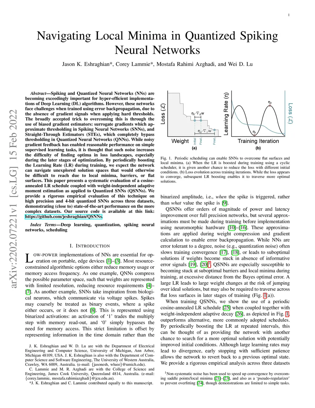 Spiking and Quantized Neural Networks (NNs) are becoming exceedingly important for hyper-efficient implementations of Deep Learning (DL) algorithms. However, these networks face challenges when trained using error backpropagation, due to the absence of gradient signals when applying hard thresholds. The broadly accepted trick to overcoming this is through the use of biased gradient estimators: surrogate gradients which approximate thresholding in Spiking Neural Networks (SNNs), and Straight-Through Estimators (STEs), which completely bypass thresholding in Quantized Neural Networks (QNNs). While noisy gradient feedback has enabled reasonable performance on simple supervised learning tasks, it is thought that such noise increases the difficulty of finding optima in loss landscapes, especially during the later stages of optimization. By periodically boosting the Learning Rate (LR) during training, we expect the network can navigate unexplored solution spaces that would otherwise be difficult to reach due to local minima, barriers, or flat surfaces. This paper presents a systematic evaluation of a cosine-annealed LR schedule coupled with weight-independent adaptive moment estimation as applied to Quantized SNNs (QSNNs). We provide a rigorous empirical evaluation of this technique on high precision and 4-bit quantized SNNs across three datasets, demonstrating (close to) state-of-the-art performance on the more complex datasets. Our source code is available at this link: https://github.com/jeshraghian/QSNNs.