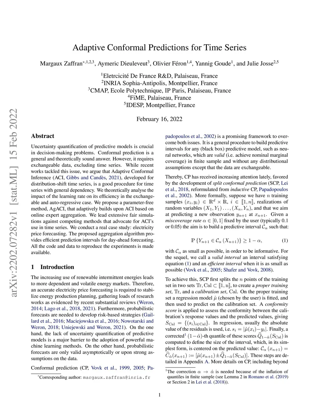 Uncertainty quantification of predictive models is crucial in decision-making problems. Conformal prediction is a general and theoretically sound answer. However, it requires exchangeable data, excluding time series. While recent works tackled this issue, we argue that Adaptive Conformal Inference (ACI, Gibbs and Cand{\`e}s, 2021), developed for distribution-shift time series, is a good procedure for time series with general dependency. We theoretically analyse the impact of the learning rate on its efficiency in the exchangeable and auto-regressive case. We propose a parameter-free method, AgACI, that adaptively builds upon ACI based on online expert aggregation. We lead extensive fair simulations against competing methods that advocate for ACI's use in time series. We conduct a real case study: electricity price forecasting. The proposed aggregation algorithm provides efficient prediction intervals for day-ahead forecasting. All the code and data to reproduce the experiments is made available.