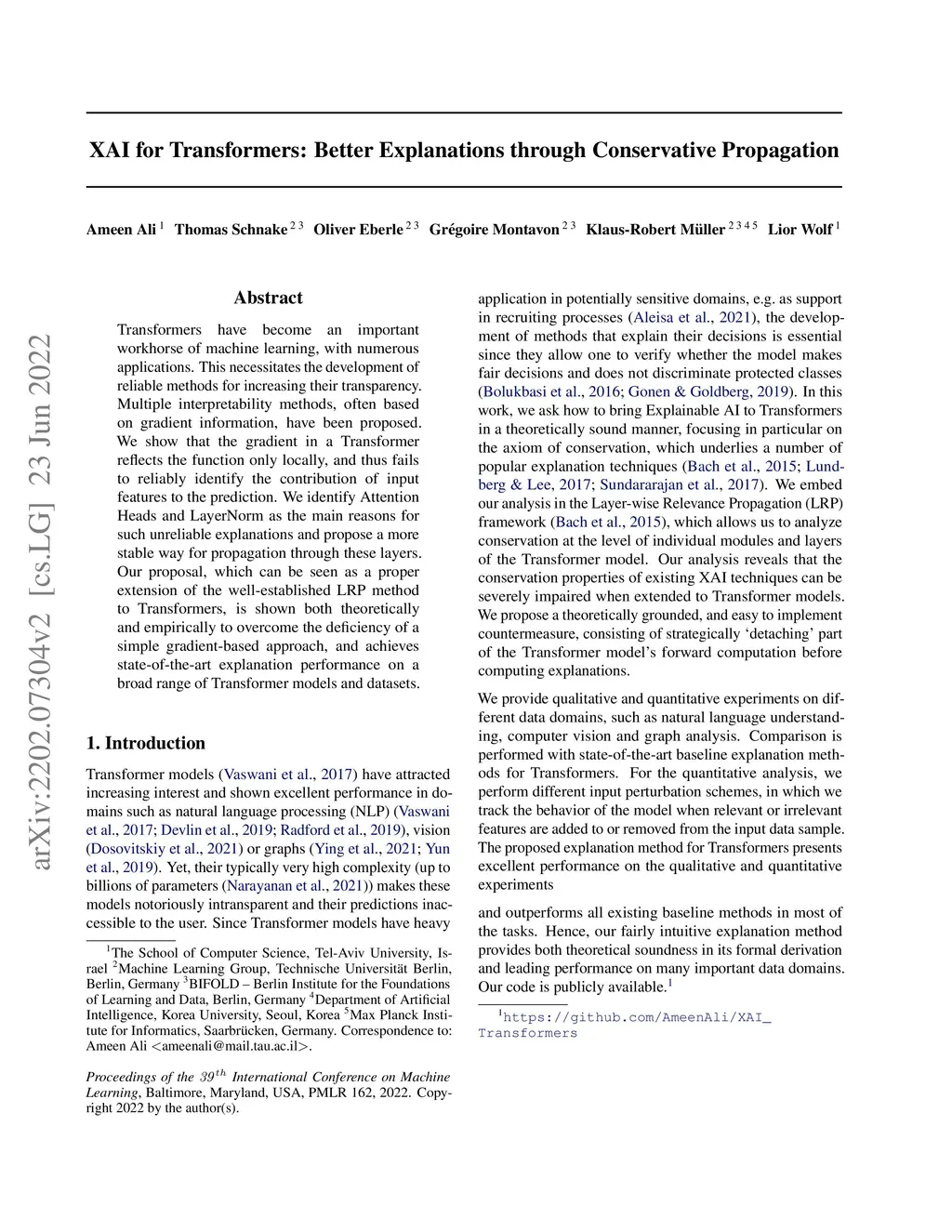 Transformers have become an important workhorse of machine learning, with numerous applications. This necessitates the development of reliable methods for increasing their transparency. Multiple interpretability methods, often based on gradient information, have been proposed. We show that the gradient in a Transformer reflects the function only locally, and thus fails to reliably identify the contribution of input features to the prediction. We identify Attention Heads and LayerNorm as main reasons for such unreliable explanations and propose a more stable way for propagation through these layers. Our proposal, which can be seen as a proper extension of the well-established LRP method to Transformers, is shown both theoretically and empirically to overcome the deficiency of a simple gradient-based approach, and achieves state-of-the-art explanation performance on a broad range of Transformer models and datasets.