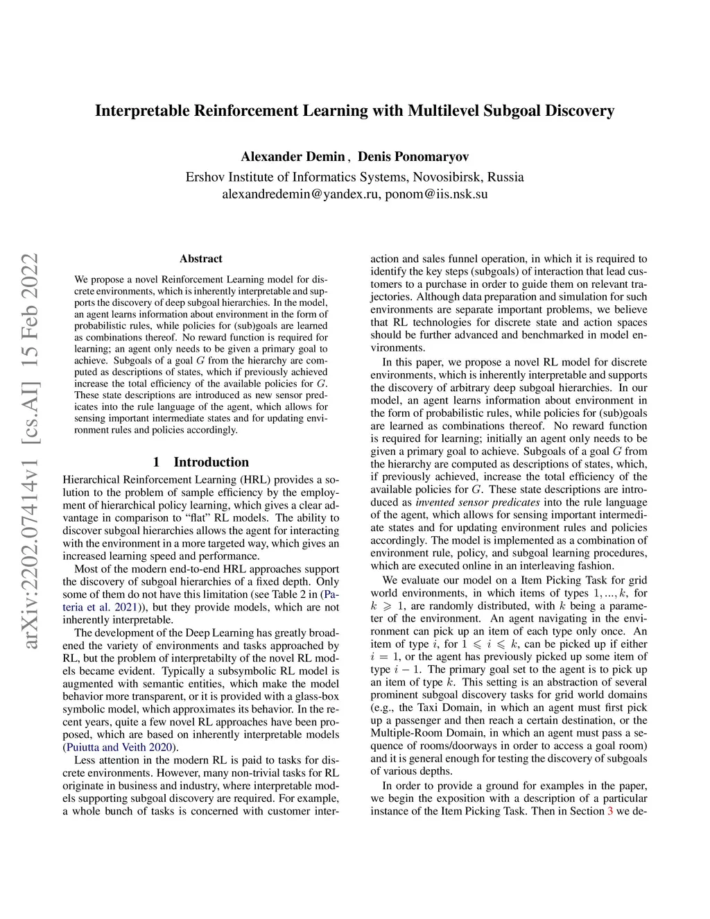 We propose a novel Reinforcement Learning model for discrete environments, which is inherently interpretable and supports the discovery of deep subgoal hierarchies. In the model, an agent learns information about environment in the form of probabilistic rules, while policies for (sub)goals are learned as combinations thereof. No reward function is required for learning; an agent only needs to be given a primary goal to achieve. Subgoals of a goal G from the hierarchy are computed as descriptions of states, which if previously achieved increase the total efficiency of the available policies for G. These state descriptions are introduced as new sensor predicates into the rule language of the agent, which allows for sensing important intermediate states and for updating environment rules and policies accordingly.
